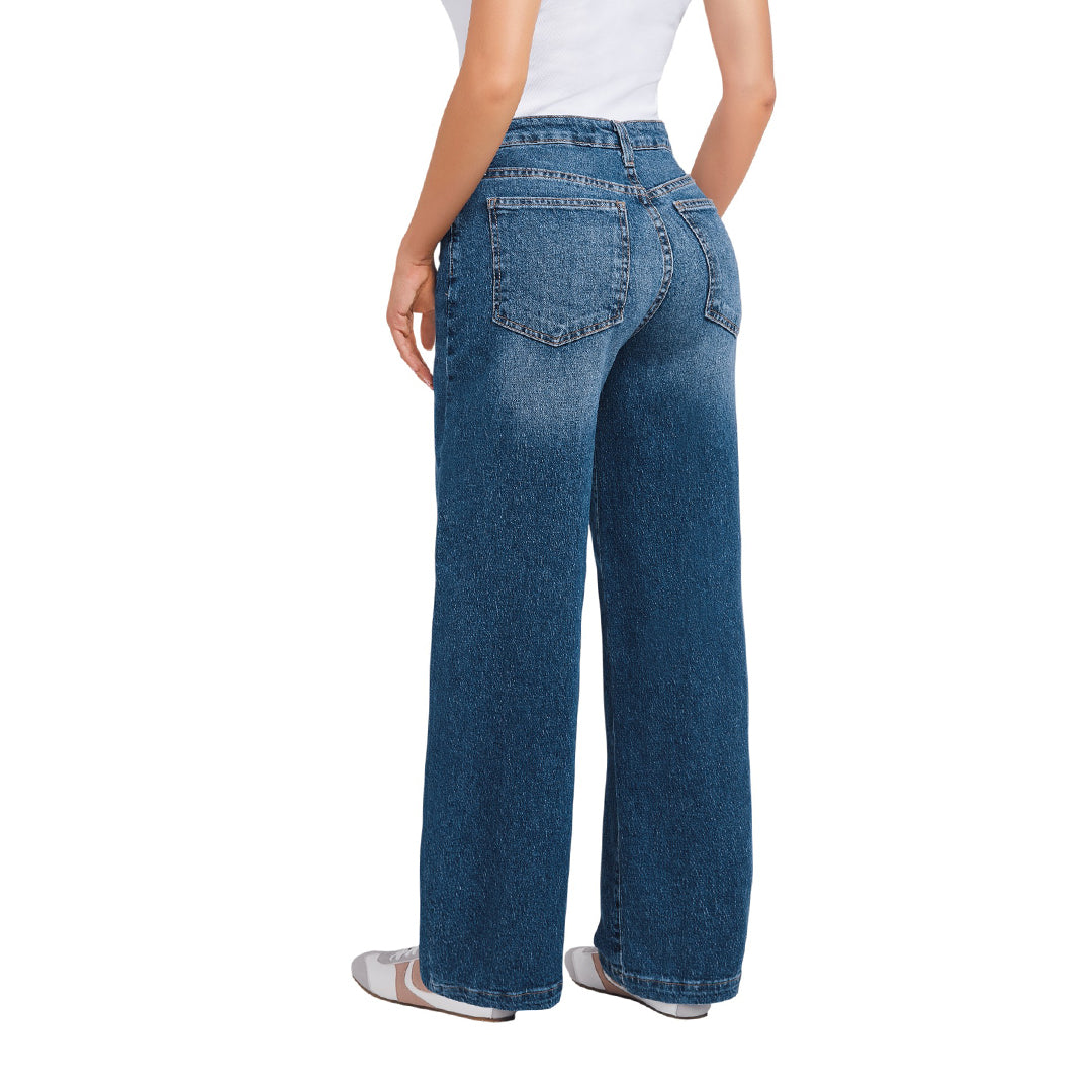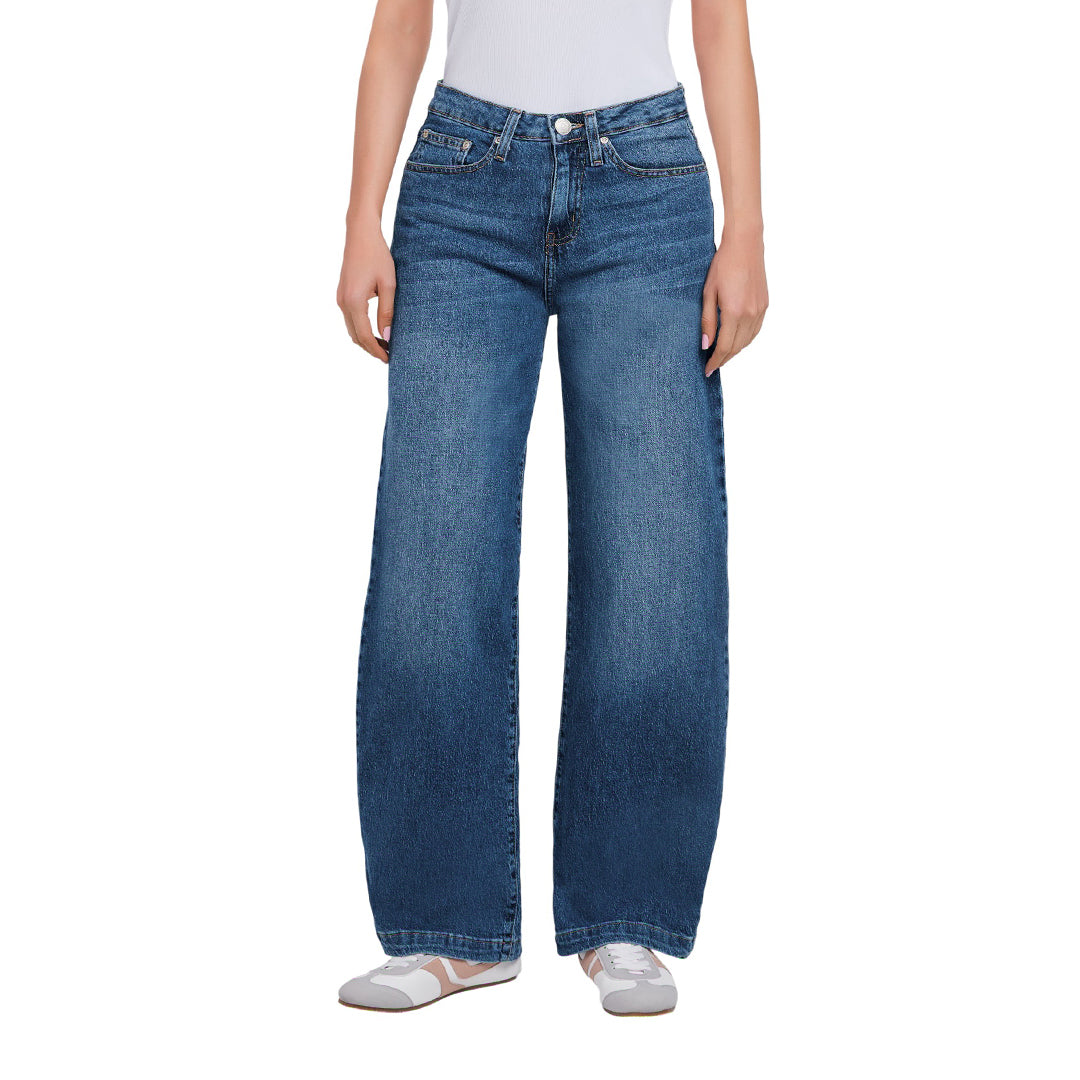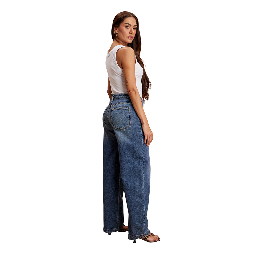 Jeans de mezclilla color azul medio con corte barril, moderno y favorecedor. Confeccionado en algodón con elastano que ofrece suavidad, flexibilidad y comodidad durante todo el día. Incluye bolsas delanteras y traseras funcionales. Perfecto para crear looks casuales, urbanos o de tendencia.
