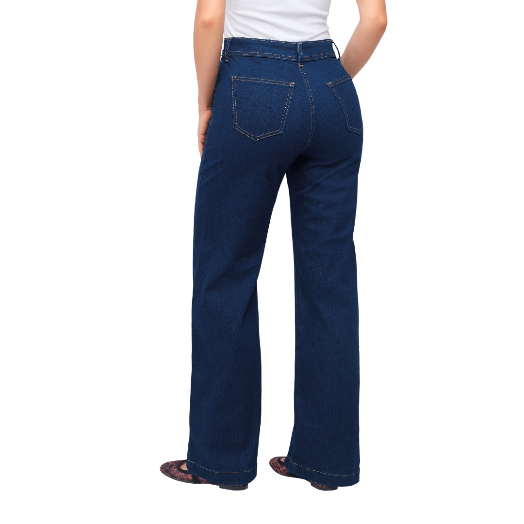 Jeans azul índigo de corte recto con costuras en contraste naranja y corte decorativo en centro de pierna. Doble presilla y bolsas traseras funcionales. Material resistente y flexible. Ideales para looks casuales, urbanos o combinaciones modernas y cómodas.
