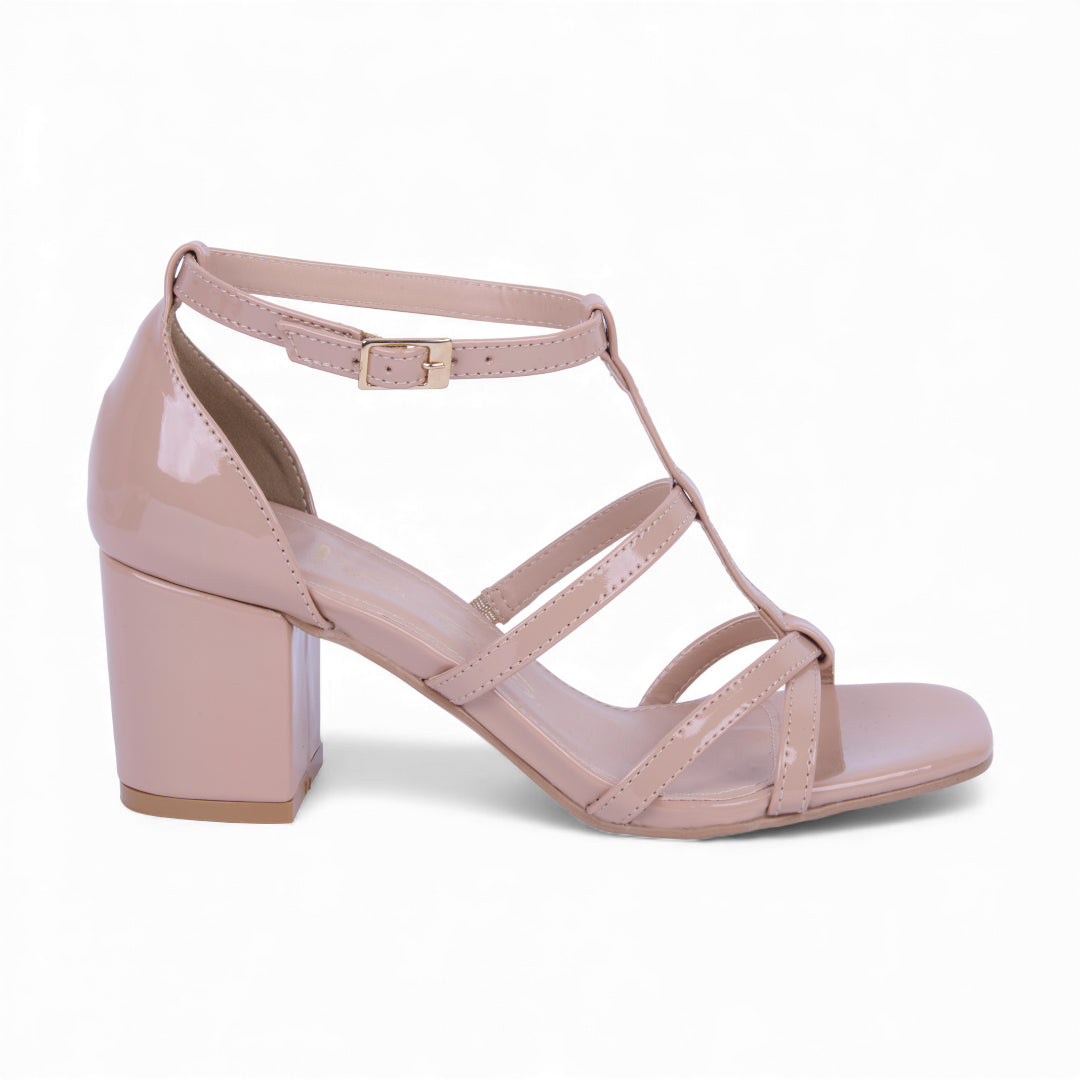 Sandalia de tacón medio de 6 cm color beige con diseño de tiras cruzadas y pulsera ajustable con hebilla metálica. Confeccionada en material sintético con plantilla suave que brinda comodidad y estabilidad. Ideal para combinar con atuendos casuales, de oficina o eventos formales gracias a su estilo moderno y versátil.