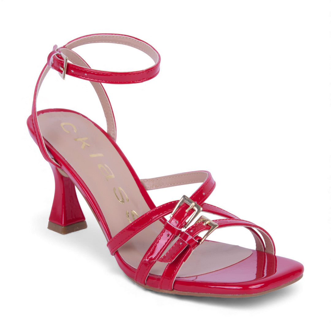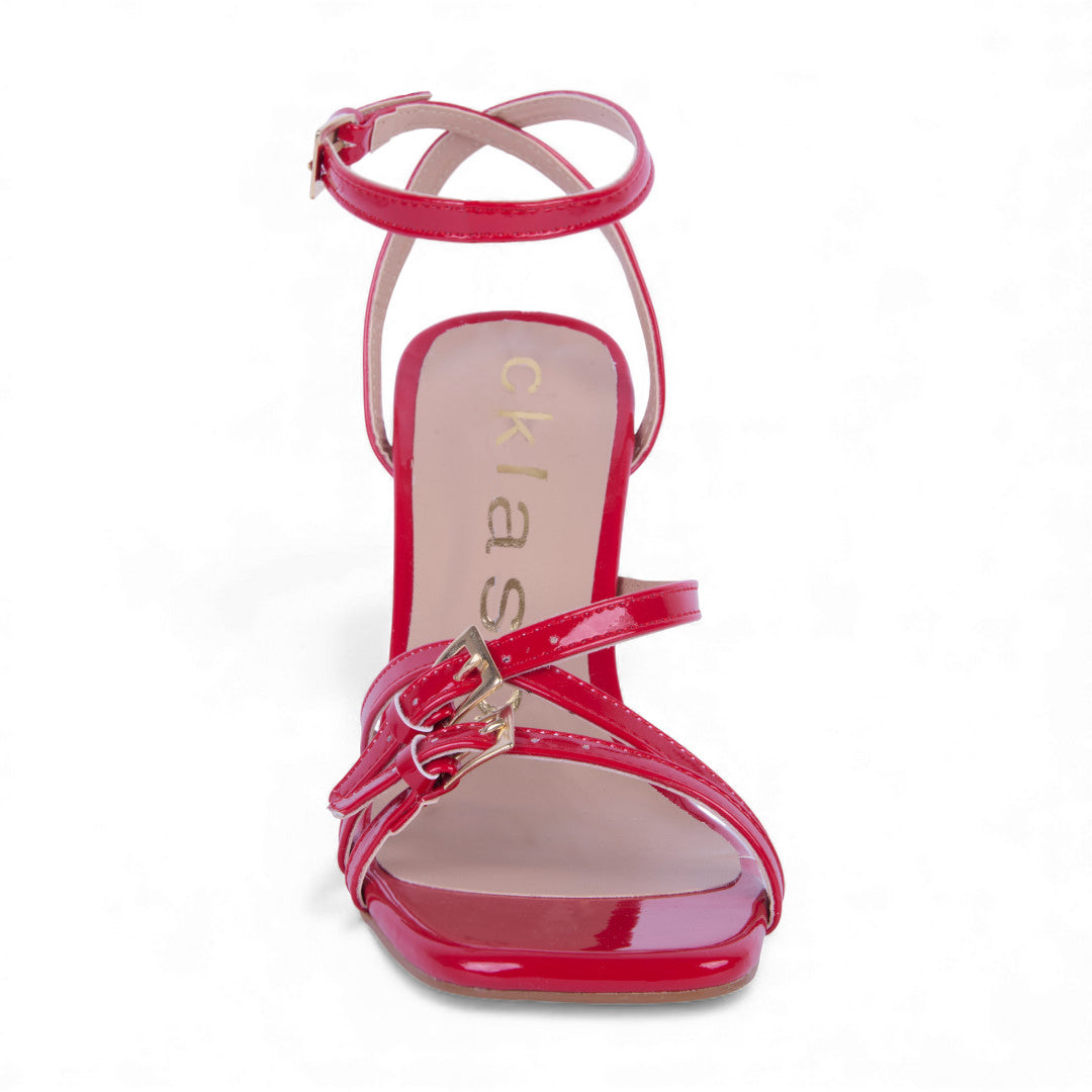 Sandalia de tacón rojo escultural de 8 cm con tiras ajustables con hebillas y pulsera; diseño elegante, moderno y llamativo para eventos o noches especiales.