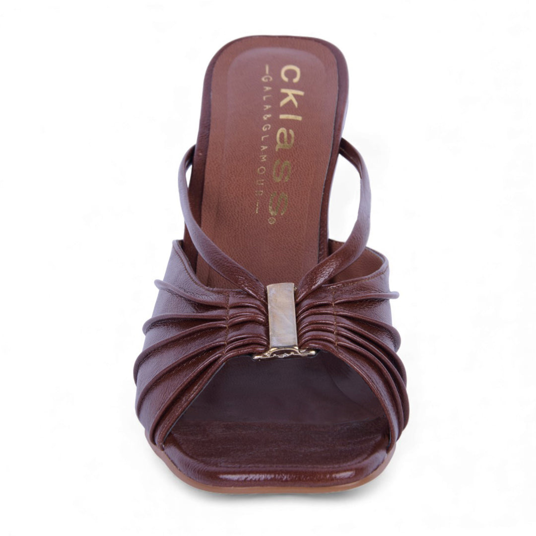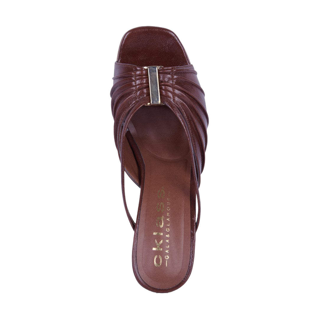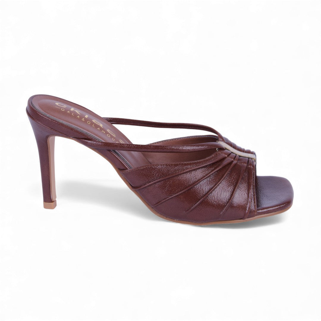 Sandalia café destalonada con tacón de 8 cm, textura plisada al frente y detalle metálico dorado. Diseño elegante con tiras delgadas y empeine descubierto para un look sofisticado.
