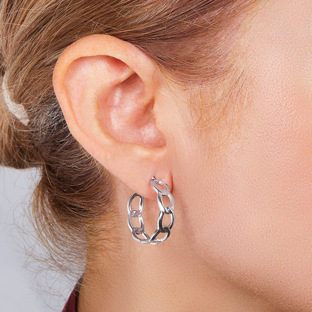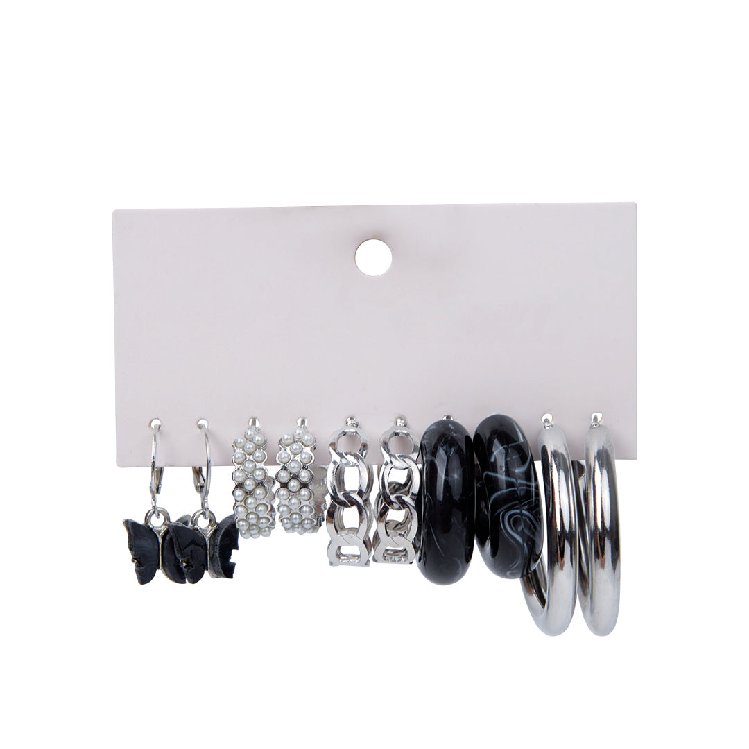 Set de 5 pares de aretes plateados y negros en tamaños variados; versátil, moderno y perfecto para cualquier ocasión.