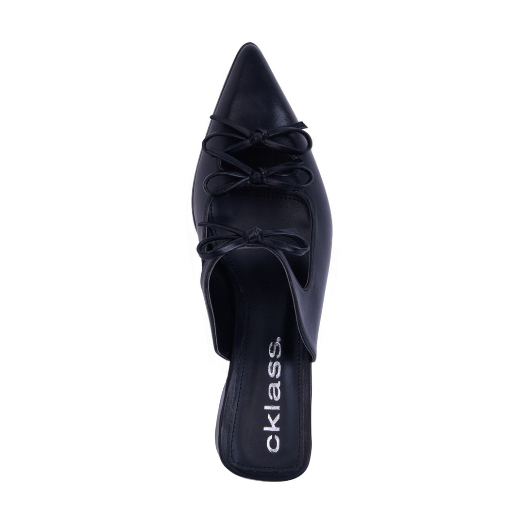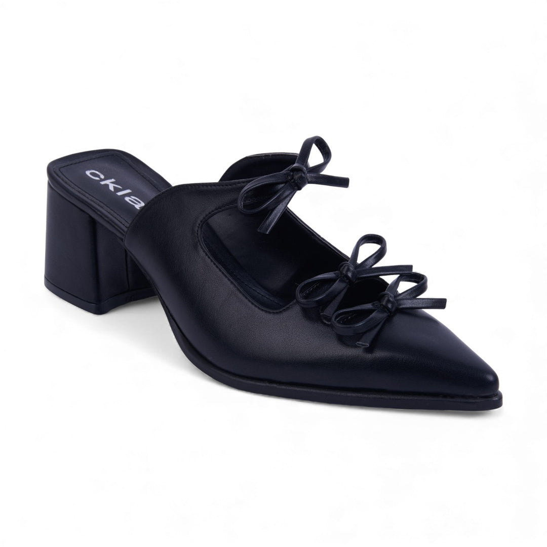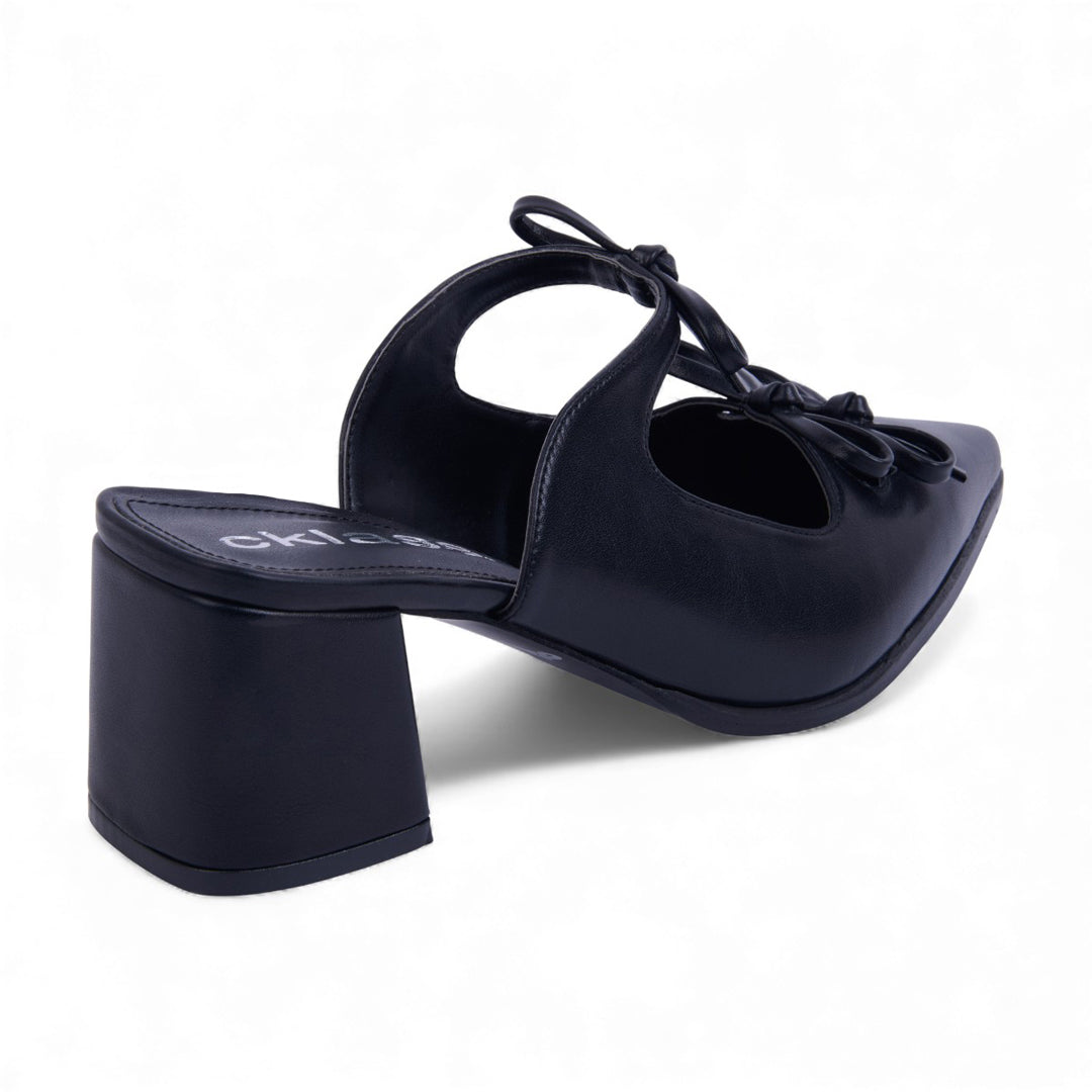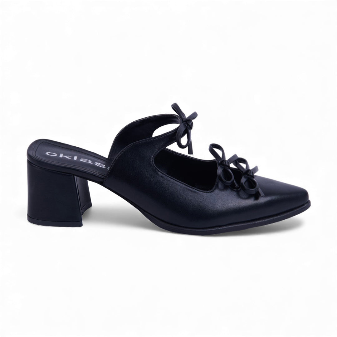 Sueco de tacón negro de 6 cm con moños decorativos y diseño elegante ideal para looks femeninos y modernos. Ligero, combinable y perfecto para cualquier ocasión.