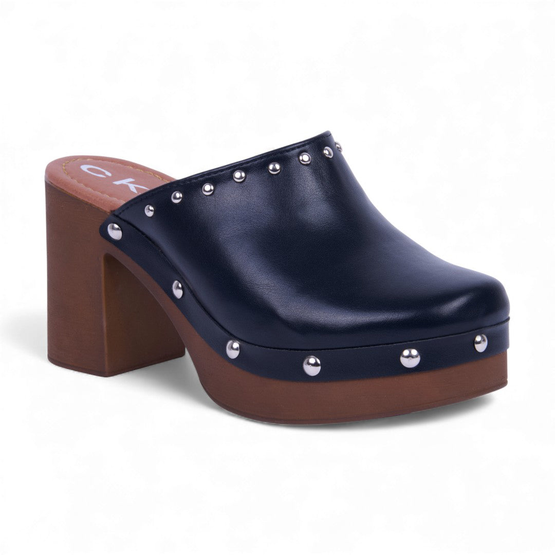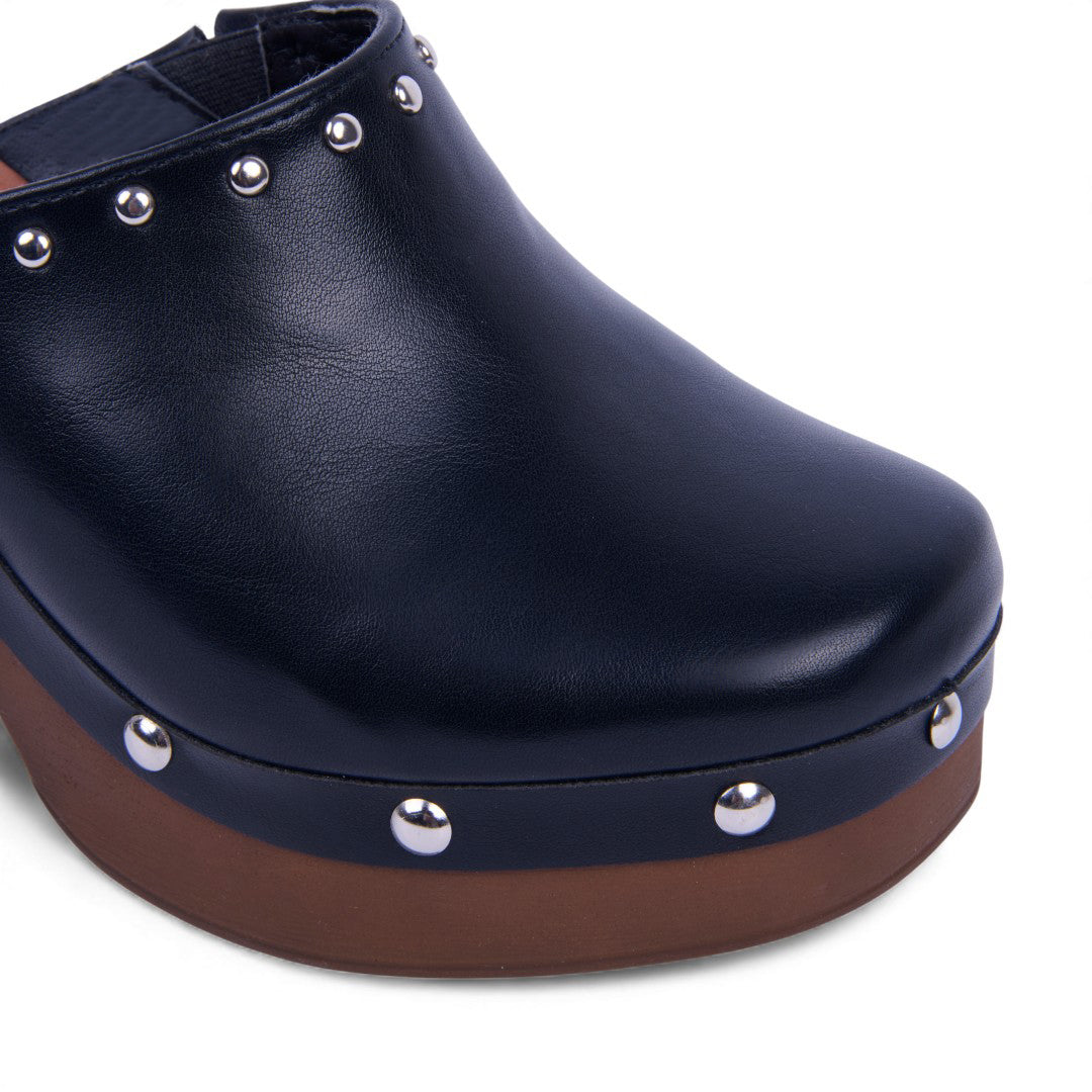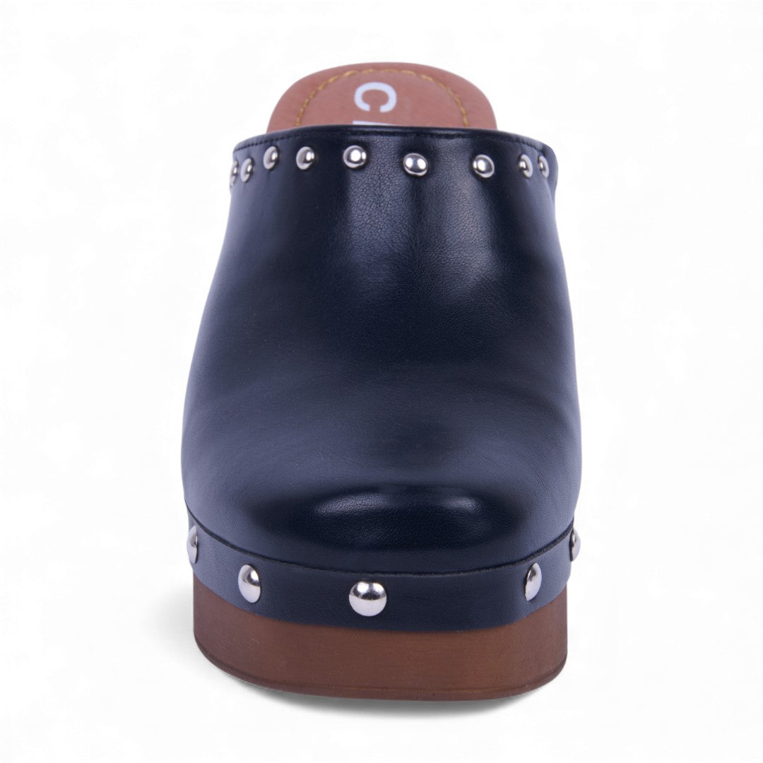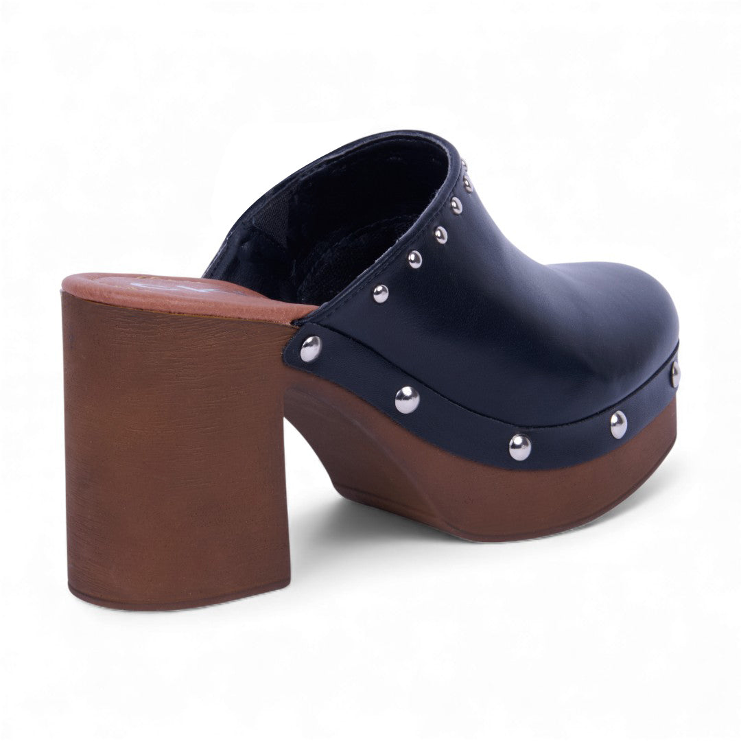 Sueco negro de tacón de 8 cm con suela tipo madera y aplicación de estoperoles metálicos. Diseño moderno, resistente y con plantilla sintética cómoda.