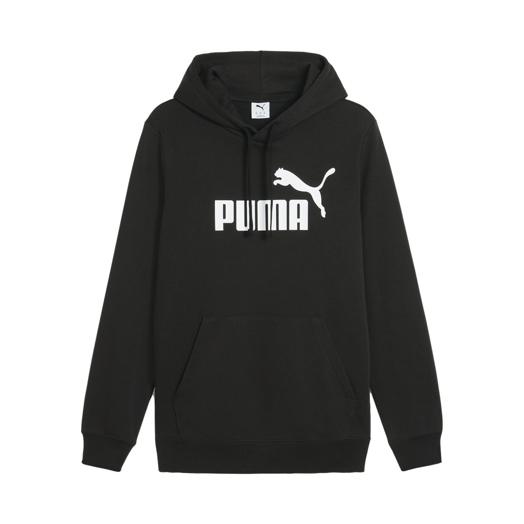 Sudadera Puma de color negro con mangas largas; detalle de gorro con cinta ajustable y estampado de la marca en el pecho de color blanco.