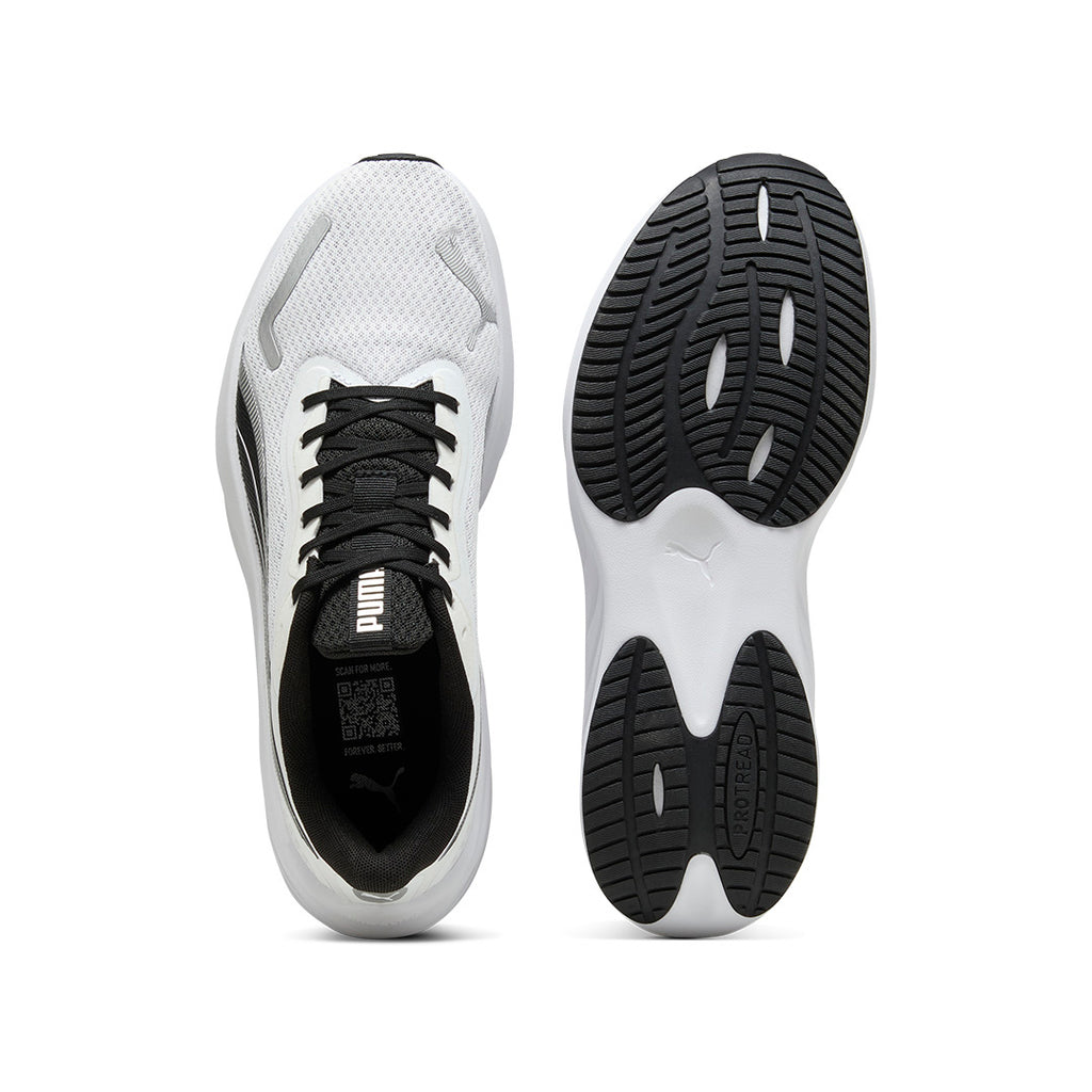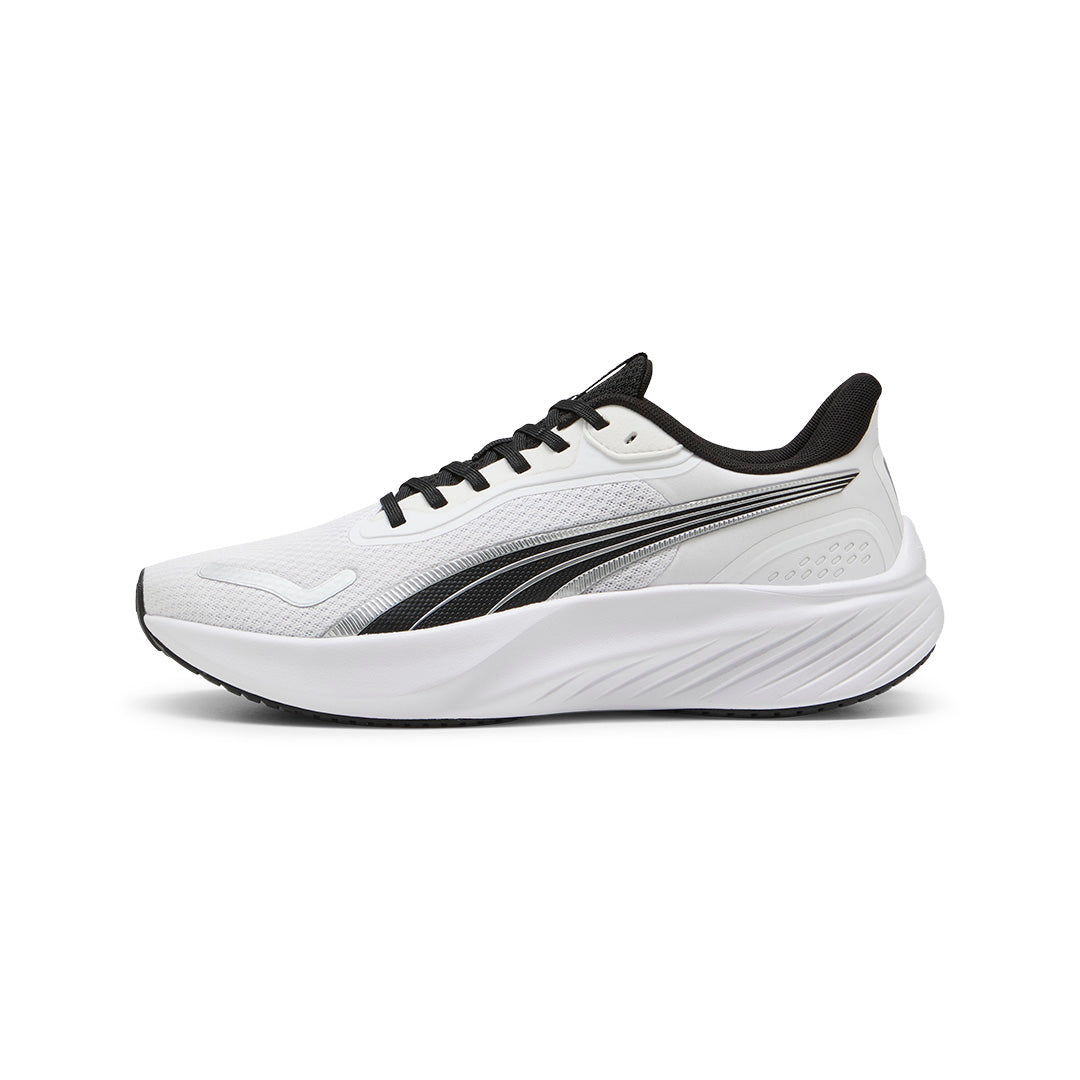 Tenis deportivos Puma color blanco para caballero, con cinta ajustable y suela confortable. Franja lateral característica de la marca que aporta estilo, comodidad y diseño moderno para uso diario o actividad física ligera.