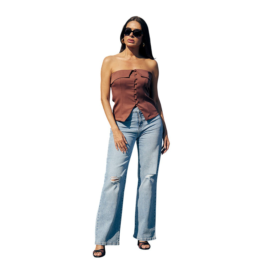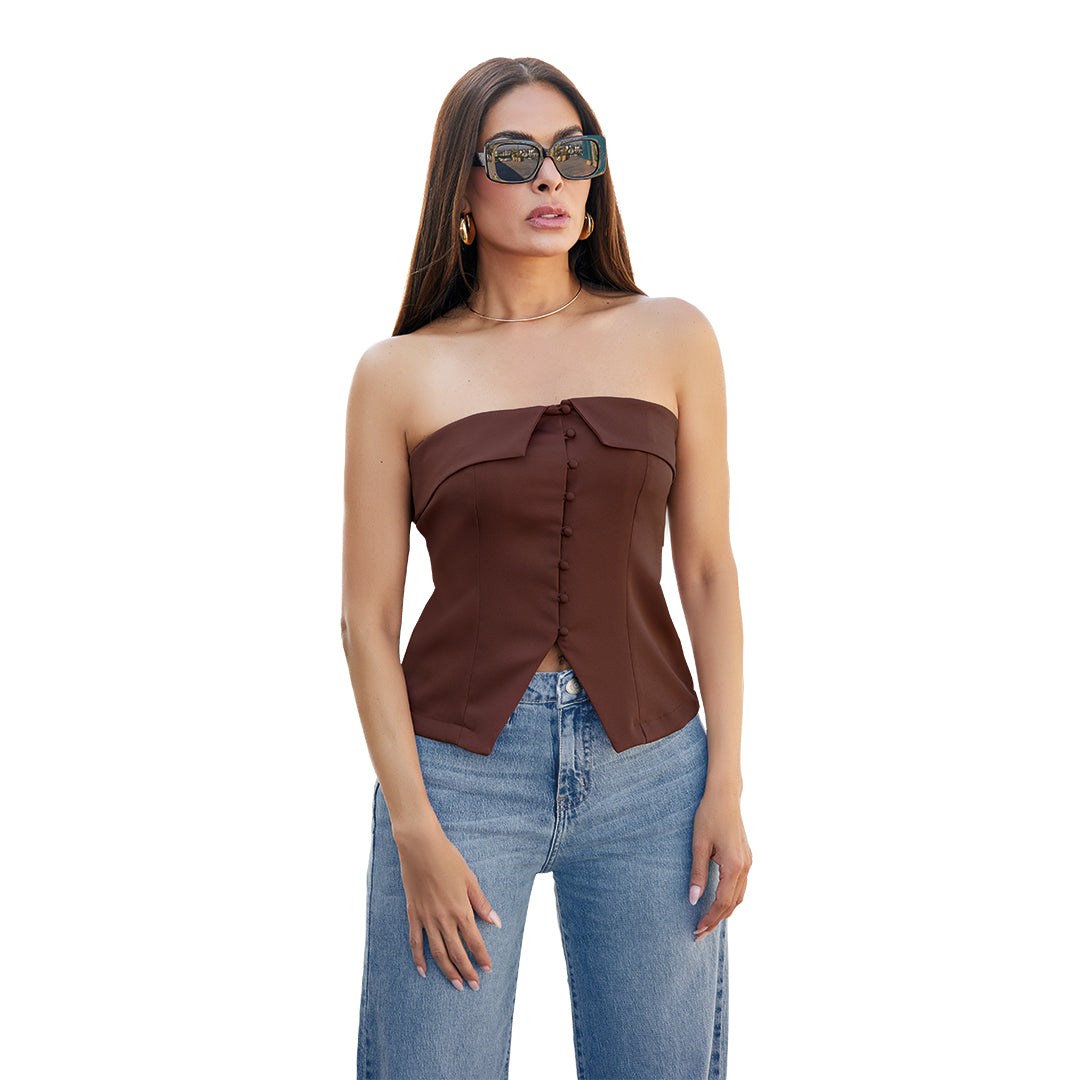 Top café strapless con detalle tipo solapa en escote y botones funcionales al tono. Cortes tipo bustier para ajuste perfecto y abertura inferior que aporta estilo. Corte slim favorecedor. Ideal para looks casuales, nocturnos o eventos especiales.