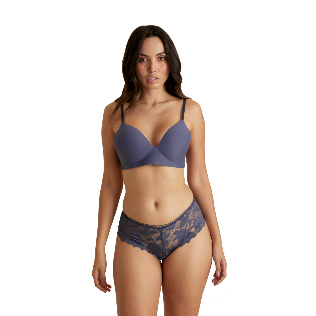 Brassiere azul acero sin varillas con encaje en espalda, copa completa, tirantes ajustables y cierre de gancho; cómodo, femenino y de soporte suave.