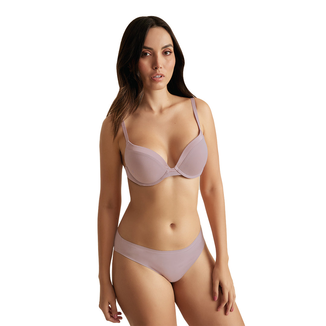 Brassiere rosa malva con push up, copa completa y contraste satinado; tirantes ajustables y cierre de gancho. Femenino, moderno y cómodo.