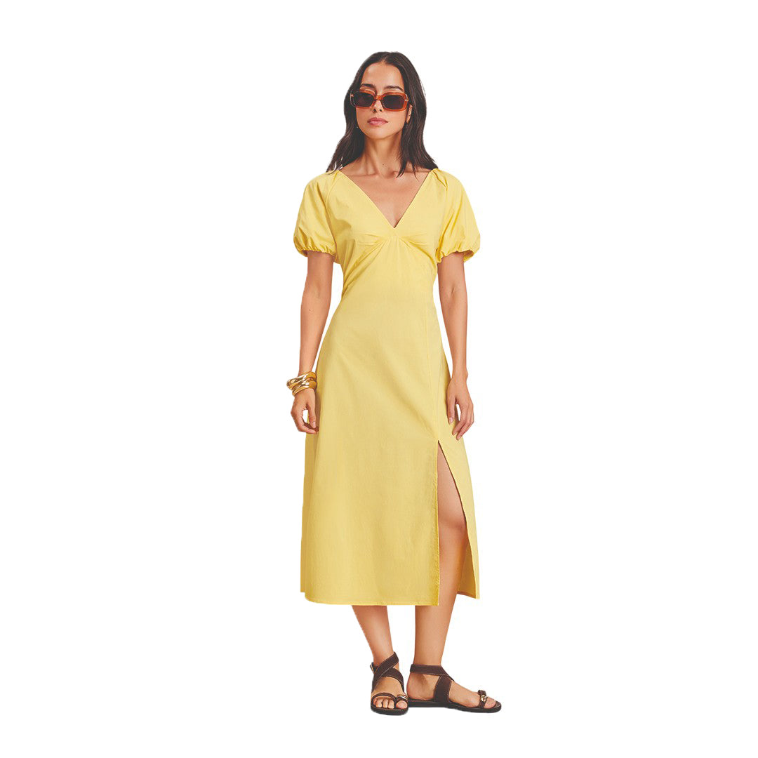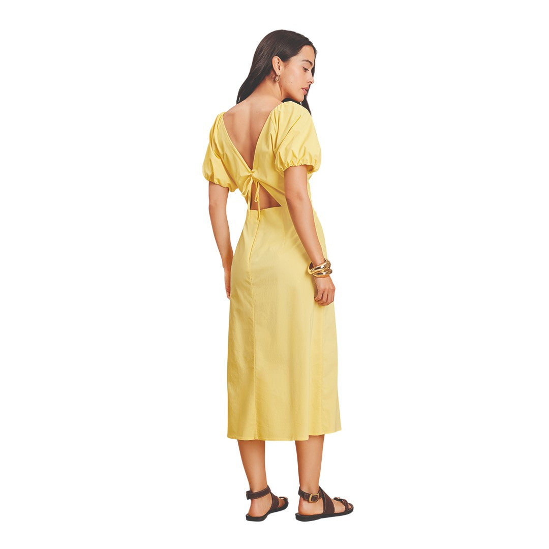 Vestido amarillo midi con escote “V”, mangas abullonadas, escote en espalda ajustable con jareta y abertura en pierna; romántico, fresco y elegante.
