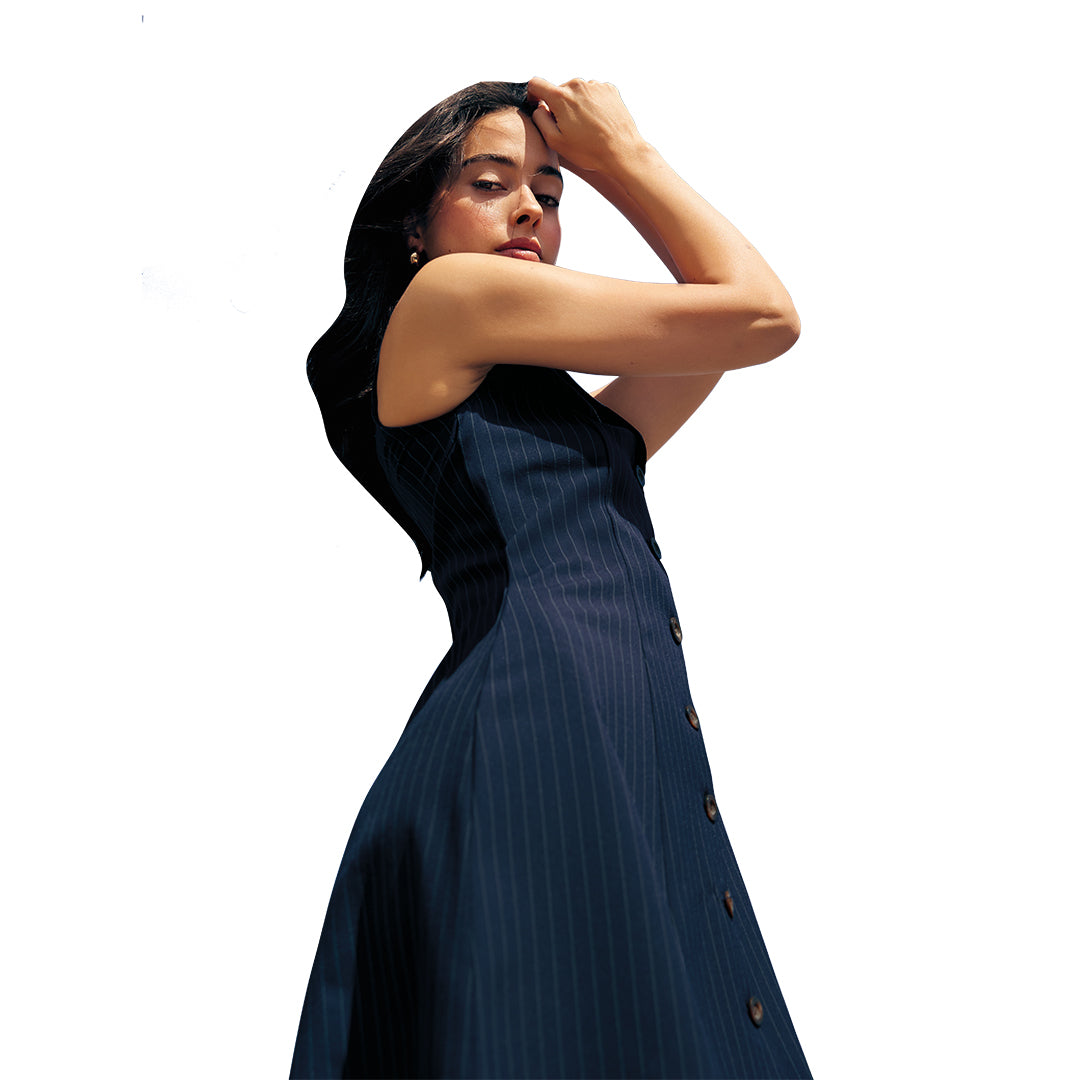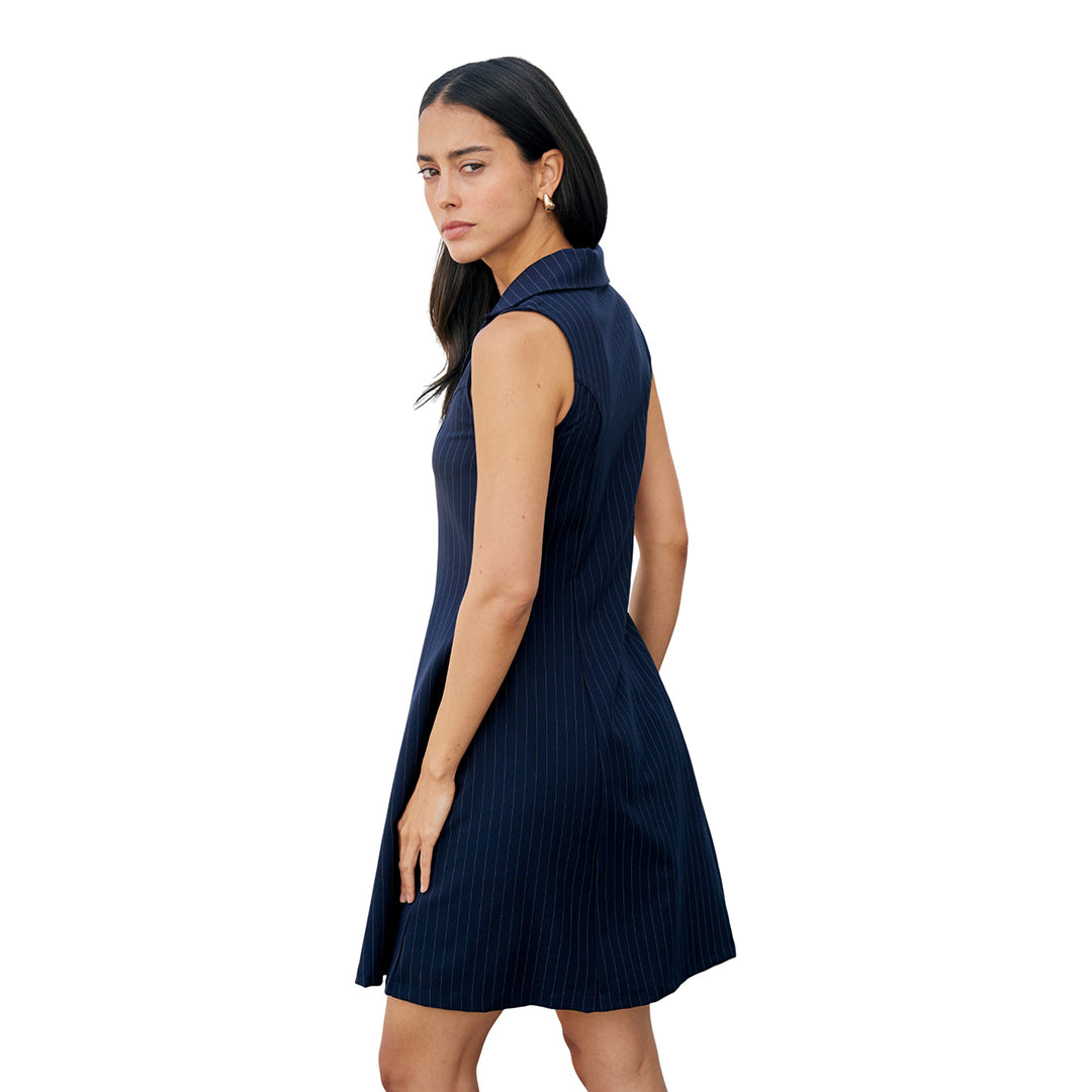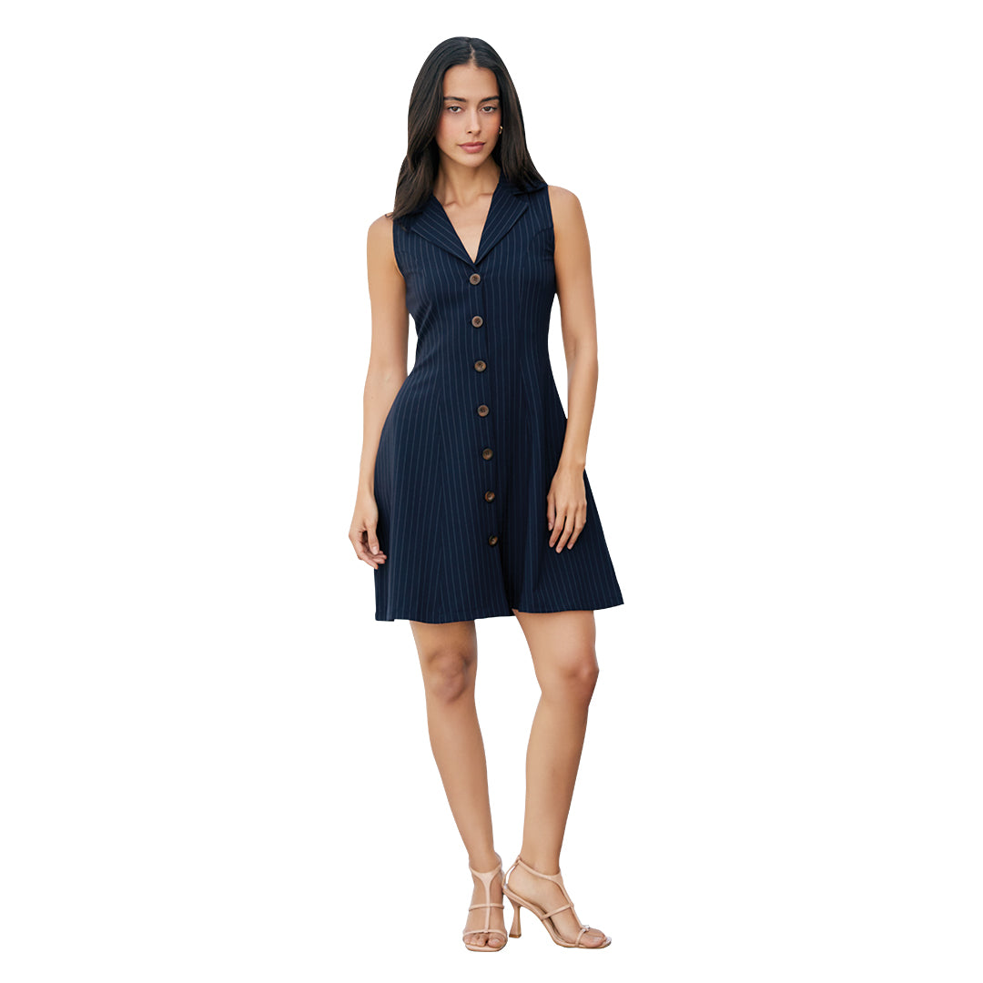 Vestido corto color azul marino con líneas blancas, sin mangas y cuello tipo resort. Cuenta con abotonadura completa al frente y confección en mezcla de poliéster y viscosa que ofrece ligereza, frescura y suavidad. Ideal para un look casual, elegante y moderno perfecto para el día a día o fines de semana.