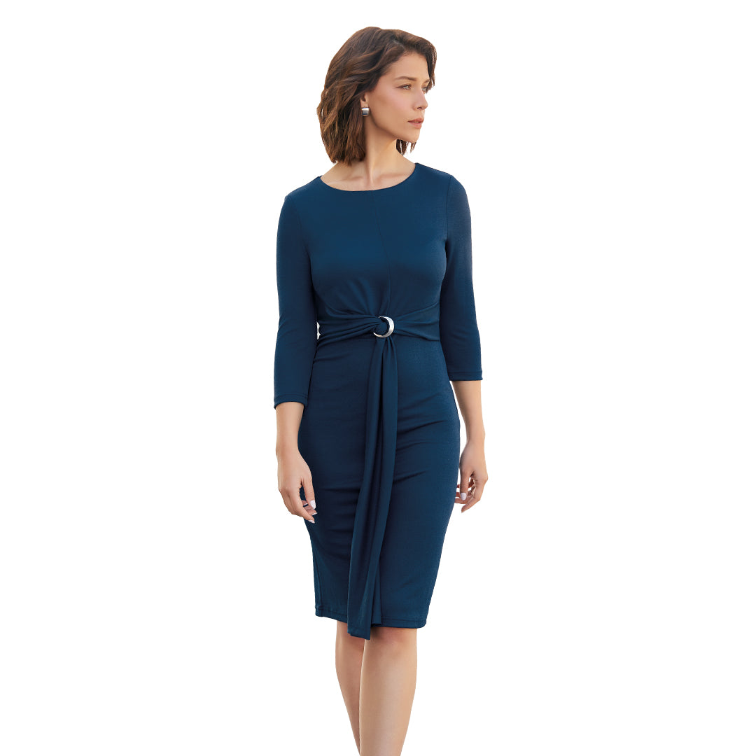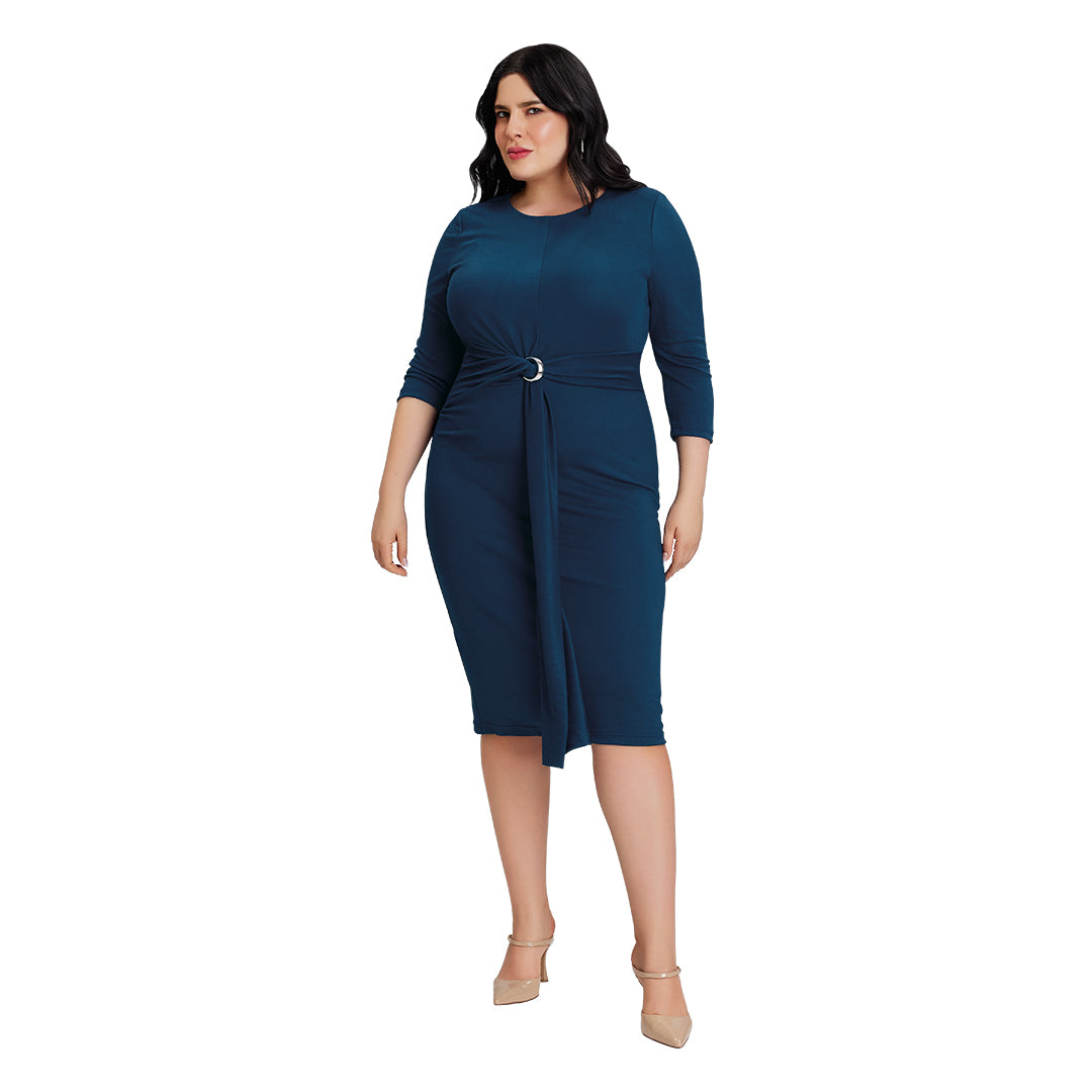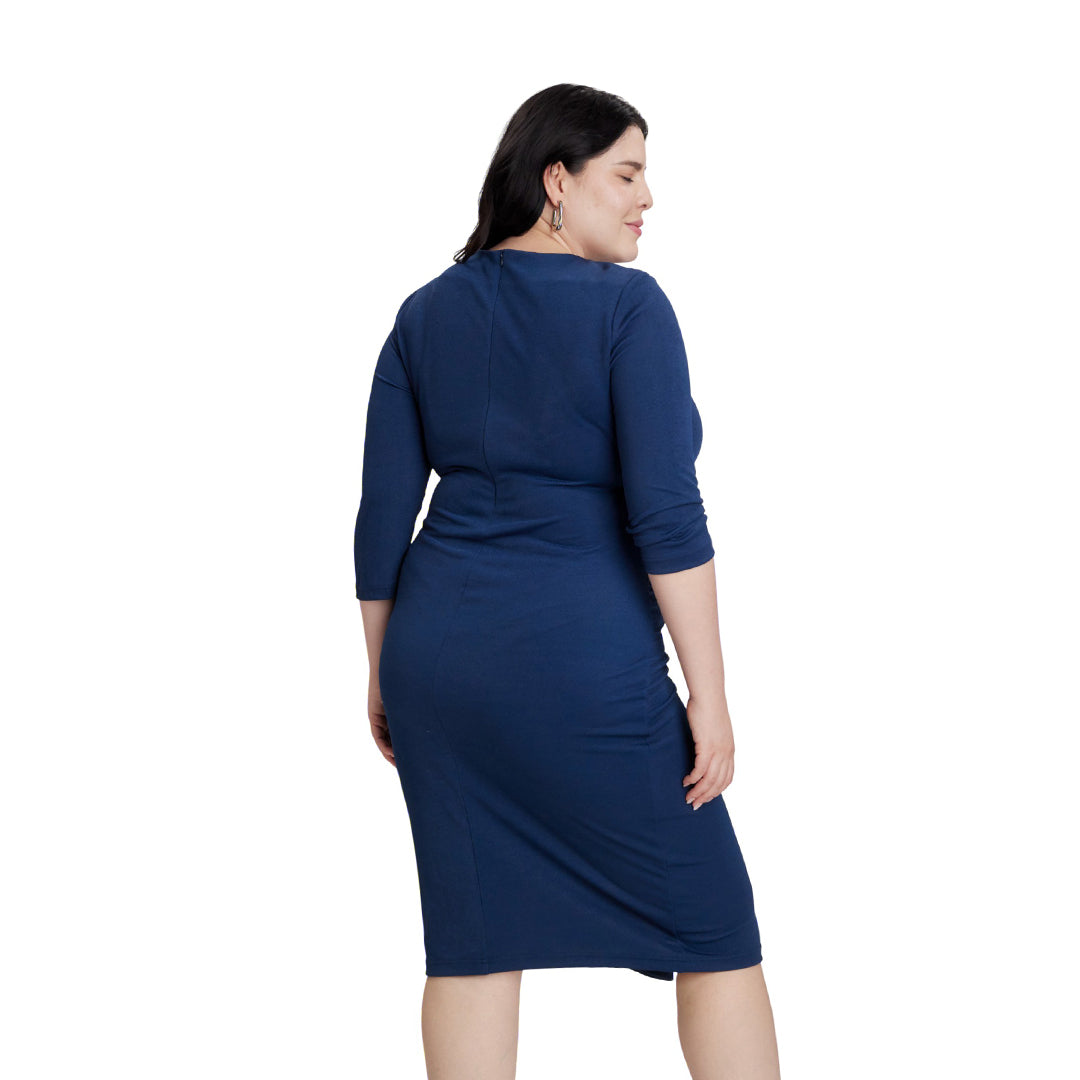 Vestido bodycon azul marino de manga larga con cuello redondo, pliegues decorativos en cintura, herraje metálico y falda con cuchilla; ajustado, moderno y perfecto para eventos o noches elegantes.