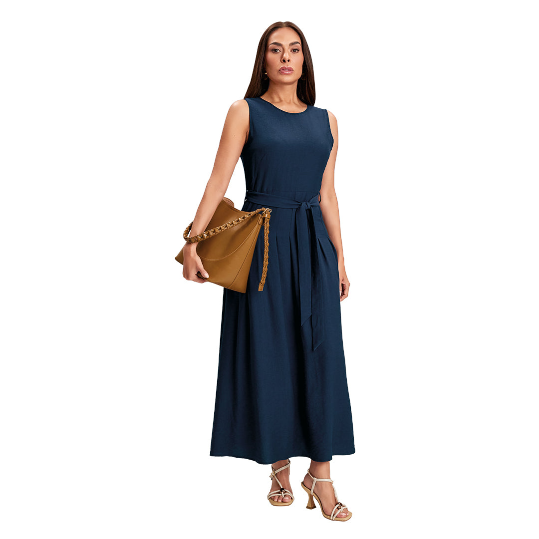 Vestido azul marino midi sin mangas, cuello redondo, pinzas que estilizan la cintura e incluye cinturón a juego; elegante, versátil y favorecedor.
