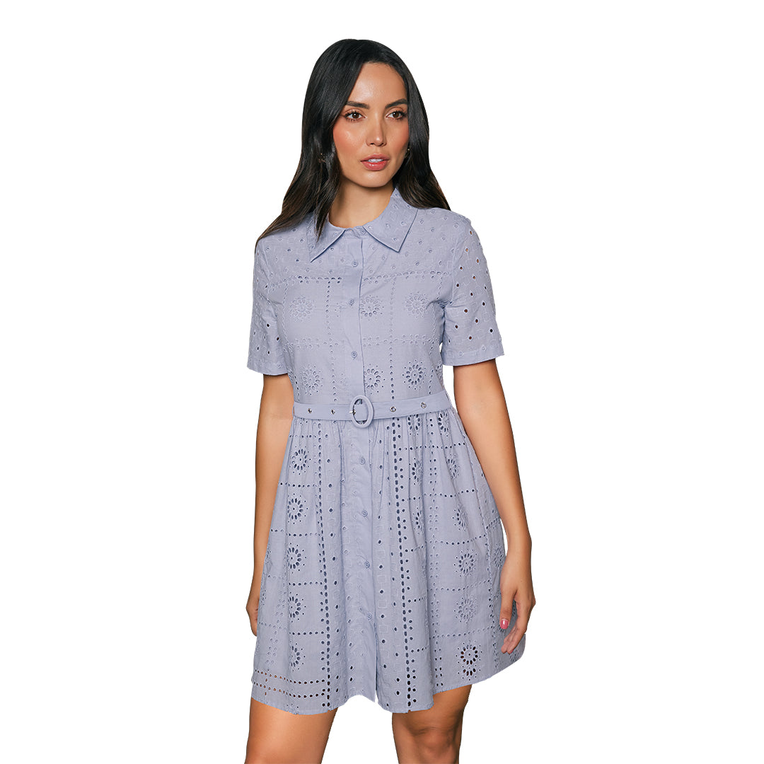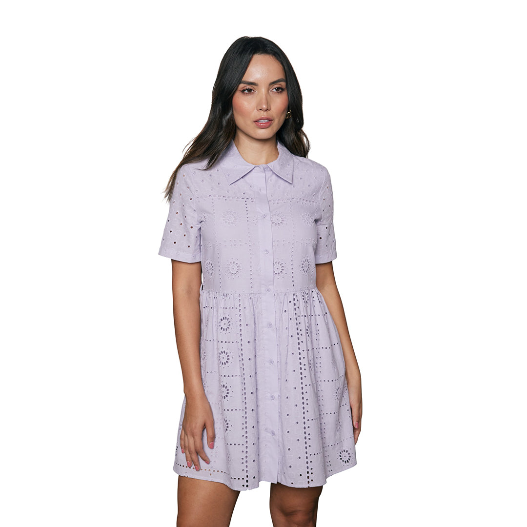 Vestido morado claro tipo camisero con tira bordada, abotonadura completa, manga corta, falda amplia y cinturón; fresco, femenino y perfecto para verano.