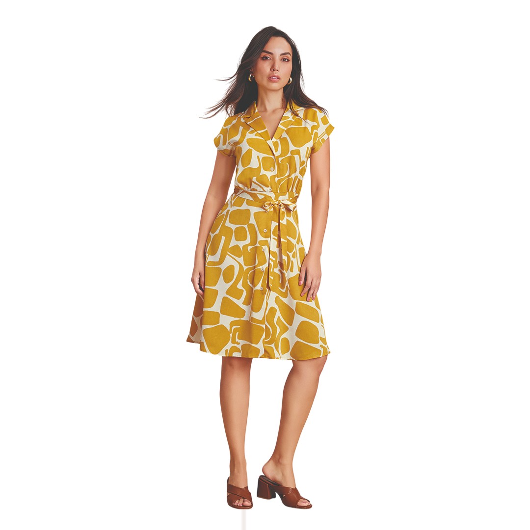 Vestido camisero corto satinado con estampado multicolor, manga corta y cinturón a juego; moderno, suave al tacto y ideal para looks frescos y vibrantes.