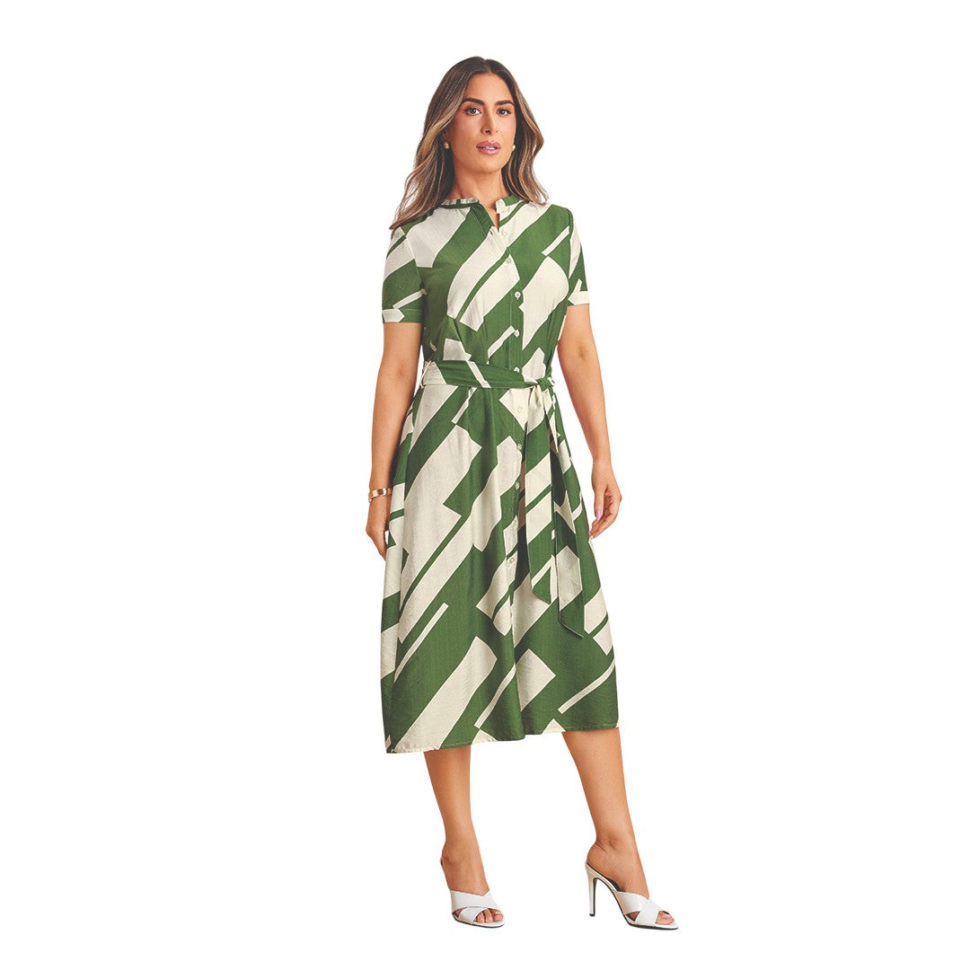 Vestido camisero midi con estampado geométrico multicolor, cuello mao, manga corta y pinzas en cintura para mejor ajuste; incluye cinturón de la misma tela para definir silueta. Ligero, moderno y elegante.
