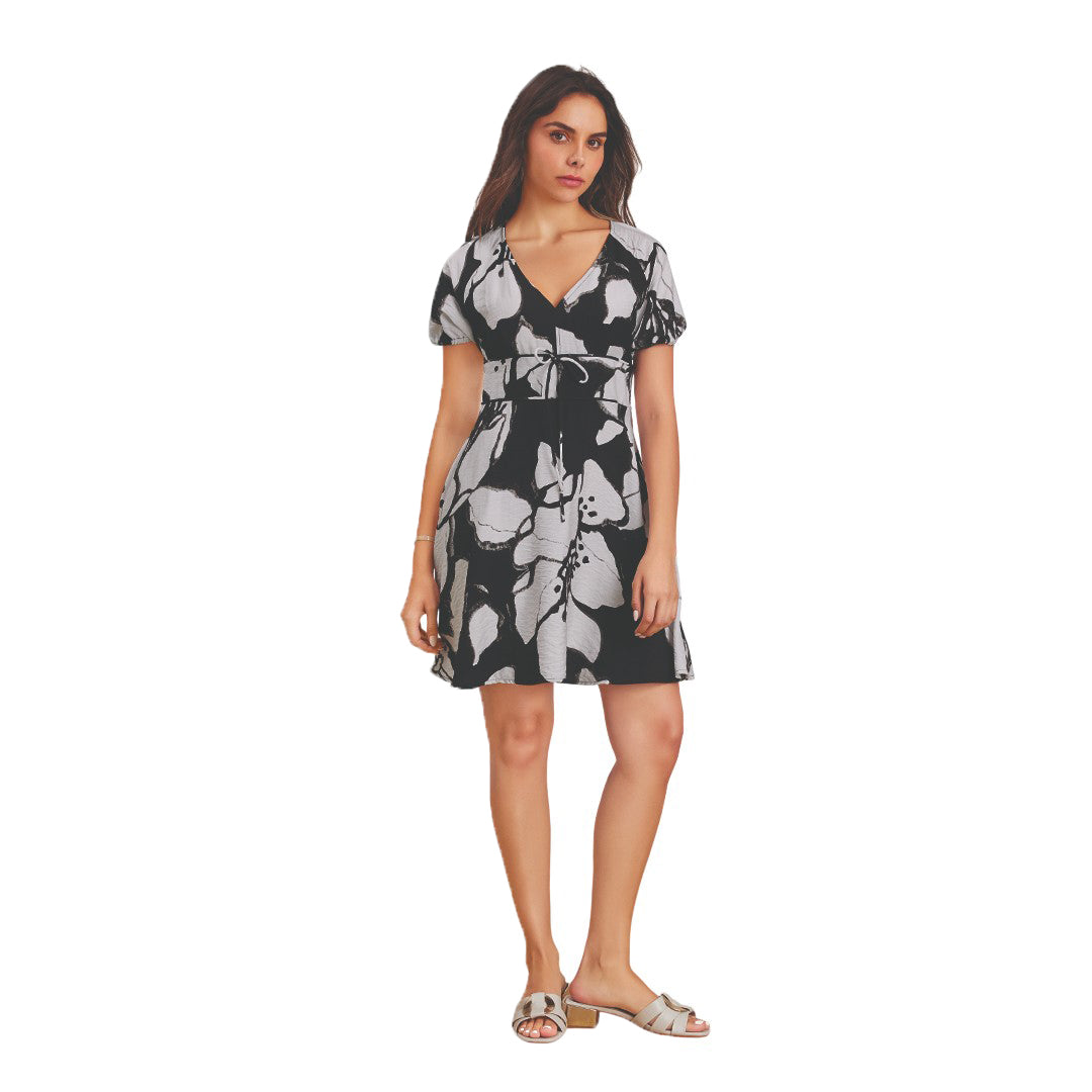Vestido corto multicolor con flores, escote “V”, manga corta con elástico y falda línea “A”; femenino, fresco y perfecto para días soleados.
