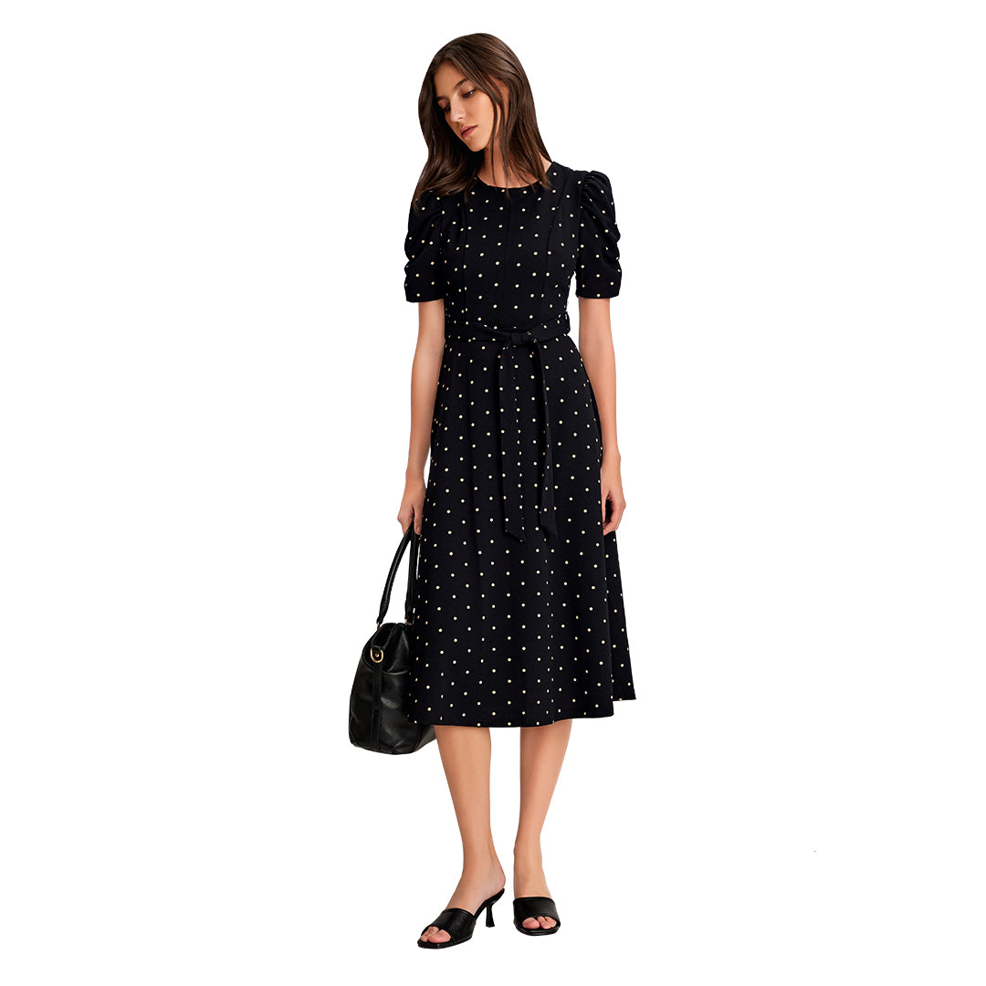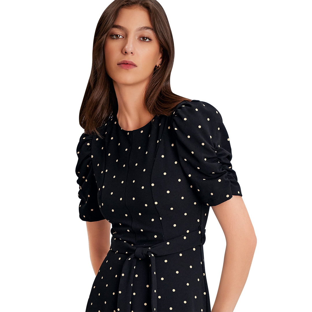 Vestido negro midi con lunares blancos, manga abullonada plisada, cintura marcada y falda línea “A”; femenino, fresco y perfecto para ocasiones casuales o semi formales.