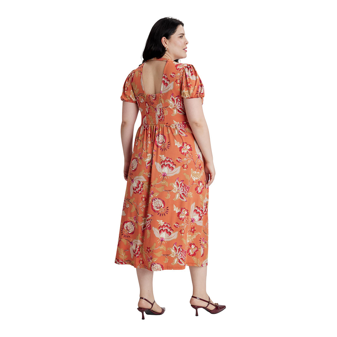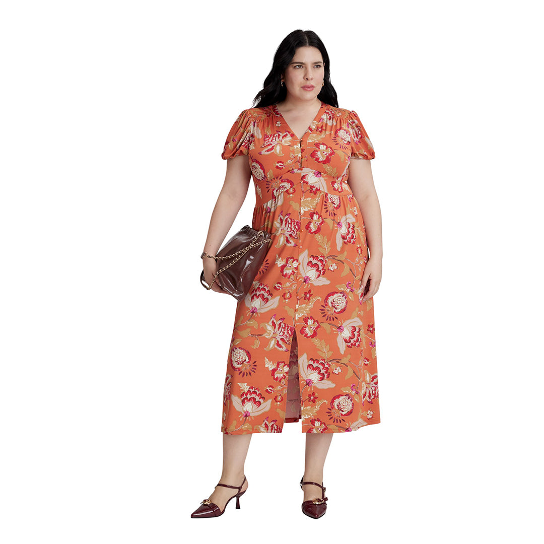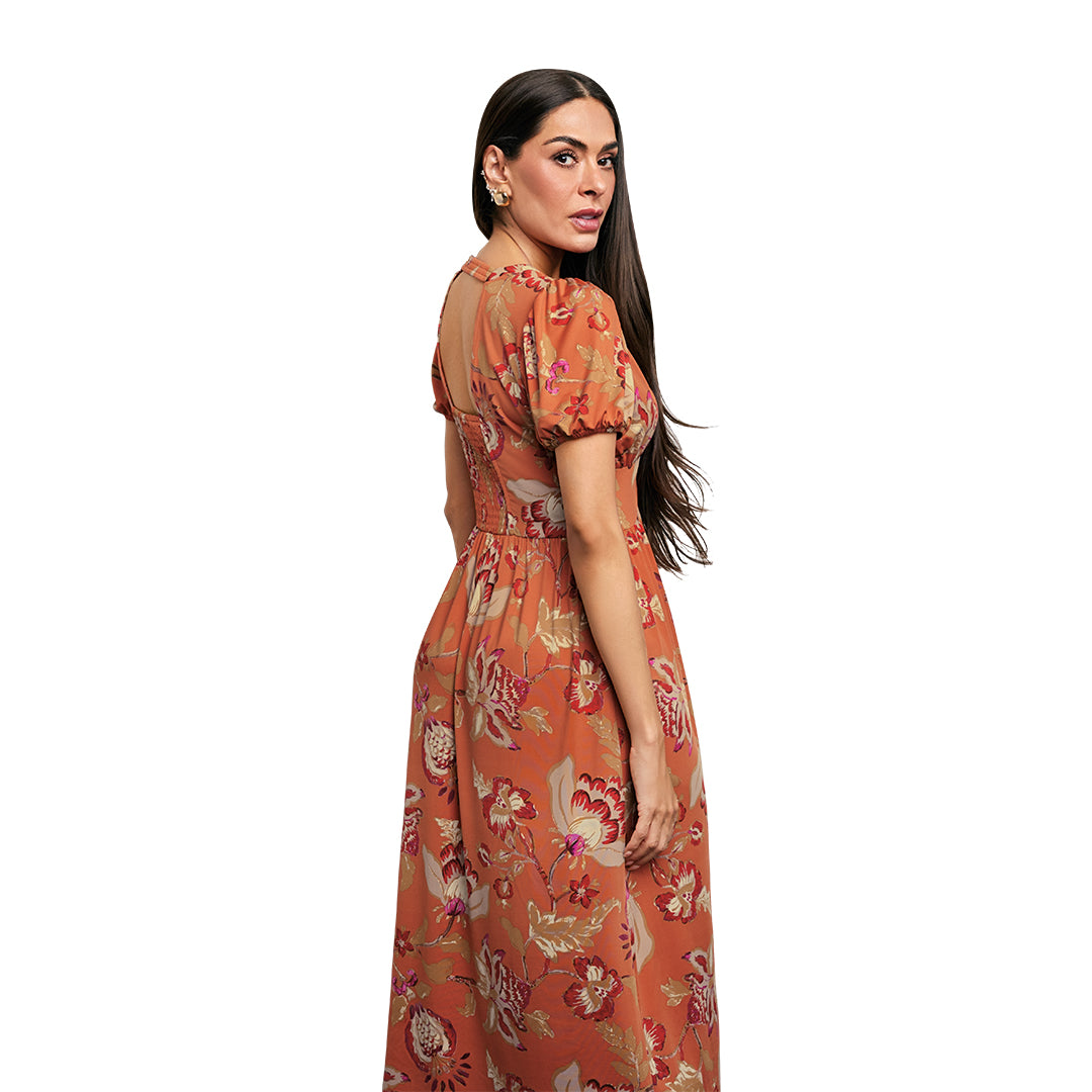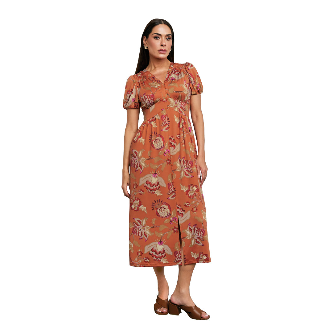 Vestido midi para mujer con estampado floral multicolor y escote en “V”. Cuenta con manga corta abullonada con elástico, corte imperio y botones forrados decorativos al frente. Espalda con escote y smog que brinda ajuste cómodo. Tacto suave y femenino.
