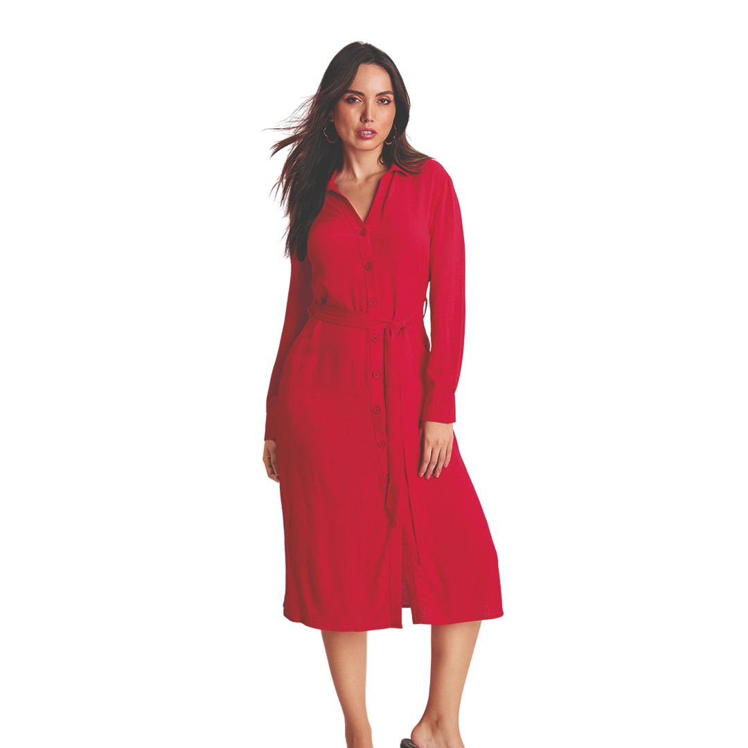 Vestido camisero rojo midi con hombro caído, manga larga y abotonadura completa al frente; cinturón de la misma tela para ajustar y estilizar. Su silueta clásica lo hace perfecto para eventos casuales o trabajo.