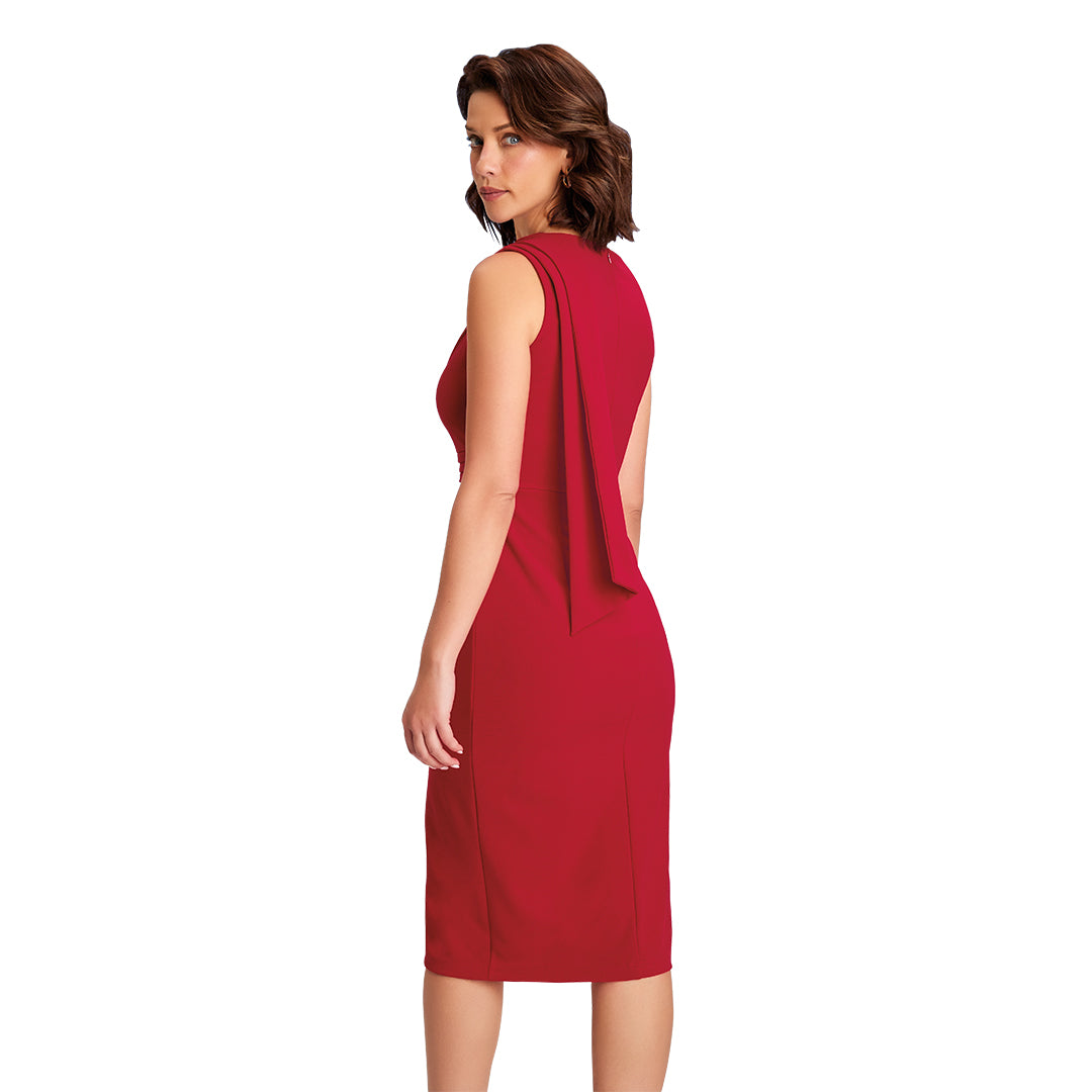 Vestido rojo bodycon con cuello asimétrico, nudo decorativo, estola integrada y falda lápiz con abertura; elegante, favorecedor y perfecto para eventos especiales.