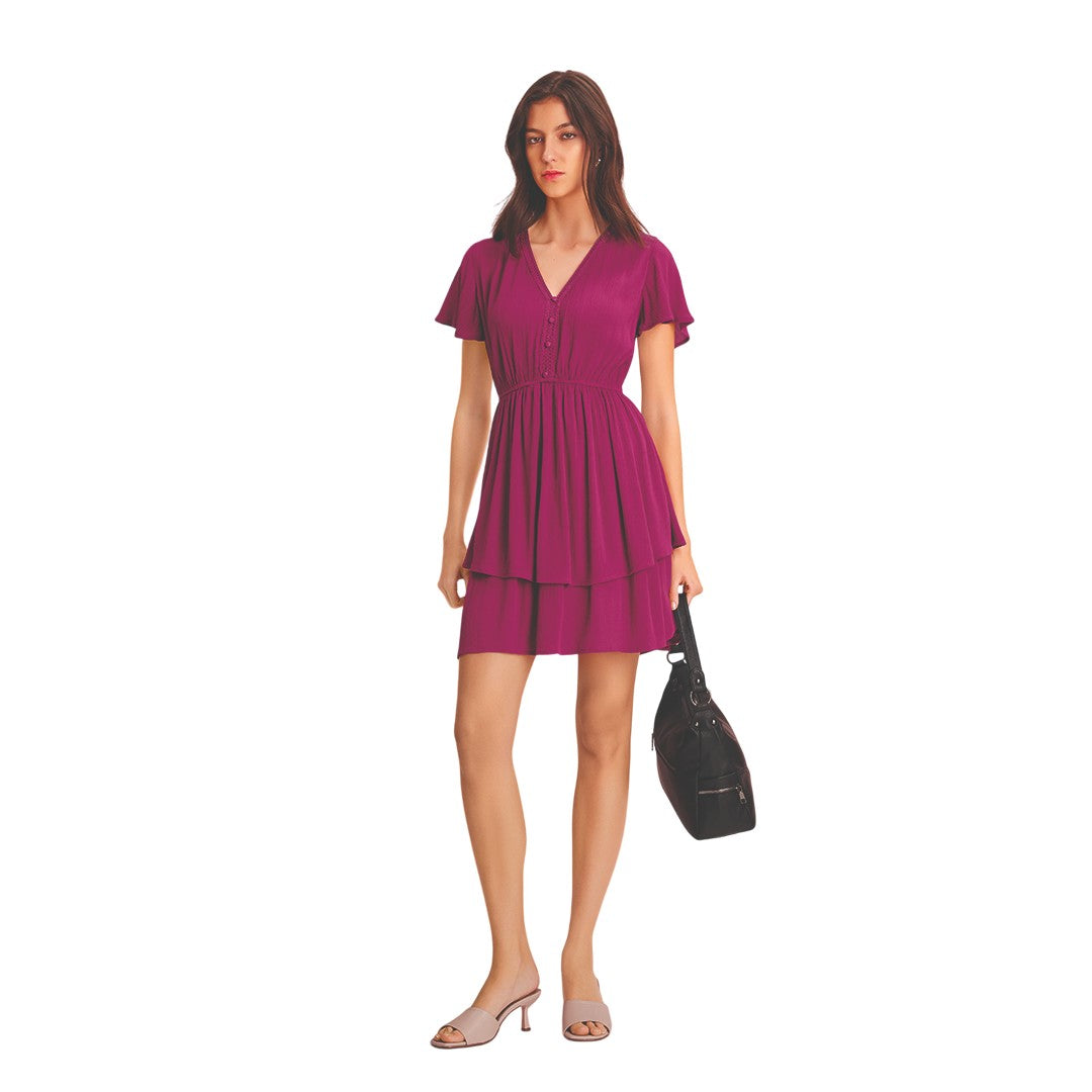 Vestido corto color tinto con escote “V”, tira bordada, botones forrados y manga corta; elástico en cintura y falda en capas plisadas para un look romántico, texturizado y femenino.