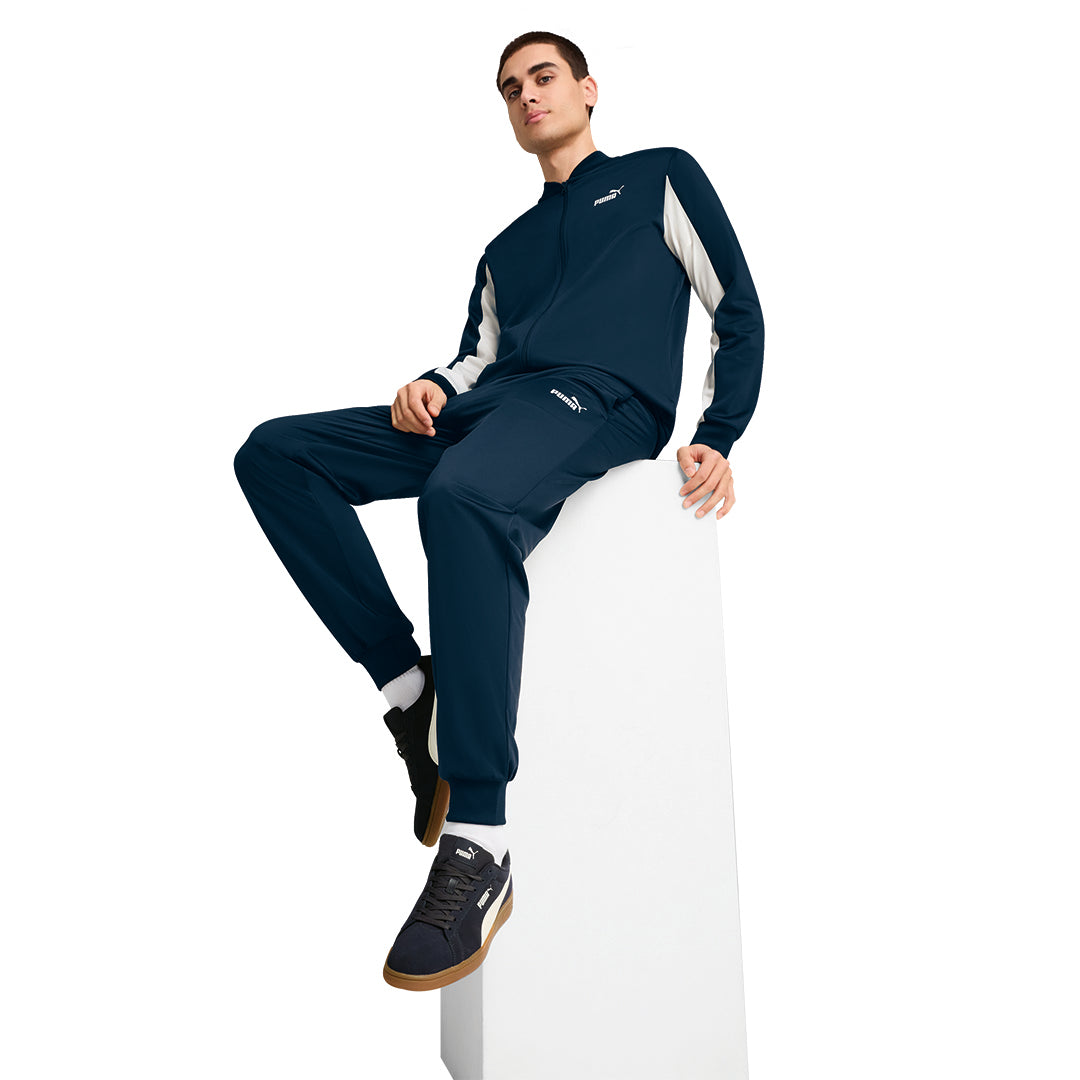 Conjunto deportivo Puma de corte clásico en poliéster con chamarra y pants; bolsillos frontales y cintura elástica con cordón para ajuste cómodo y práctico para entrenamiento diario.