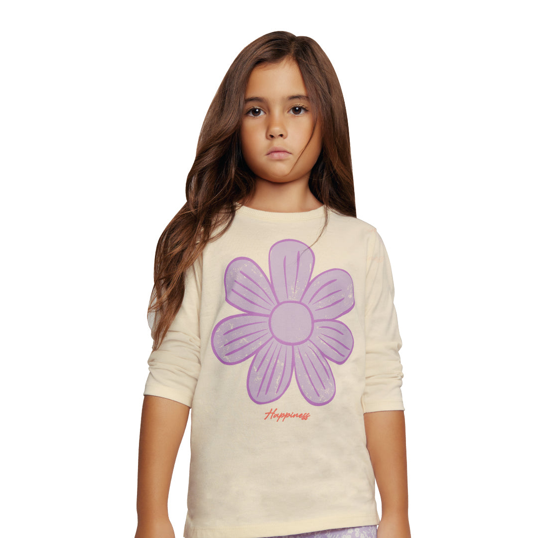 Blusa multicolor de manga larga para niña confeccionada en algodón suave. Presenta estampado floral alegre y cuello redondo clásico. Diseño cómodo, ligero y fresco, ideal para uso diario, escuela o salidas casuales con estilo infantil moderno.