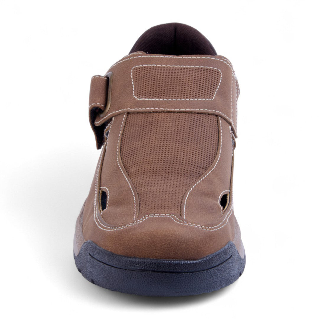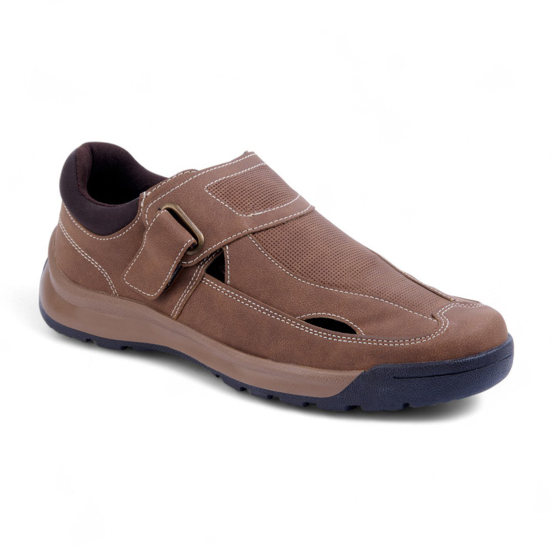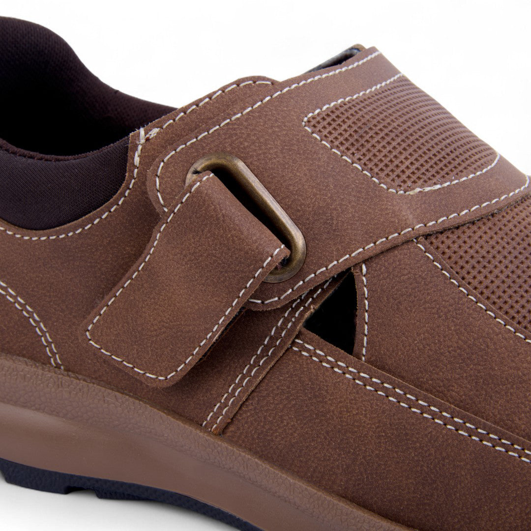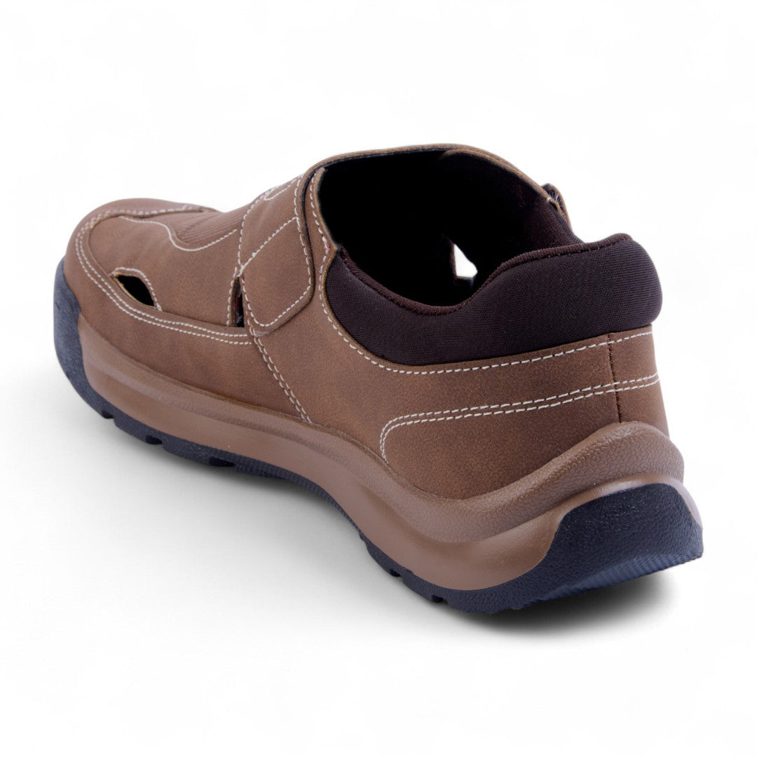 Sandalia de piso con diseño cerrado y aberturas laterales que proporcionan ventilación y estilo. Tira con contactel y plantilla acolchada sintética para máxima comodidad. Color miel versátil. Ideal para looks casuales, urbanos o paseos con estilo y confort.