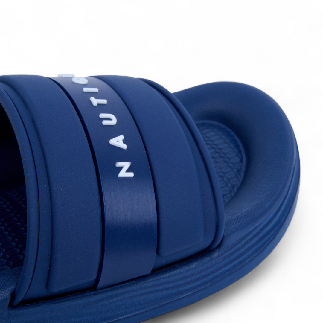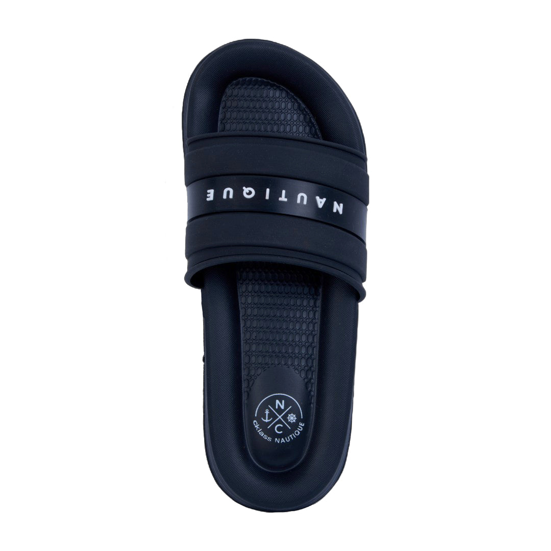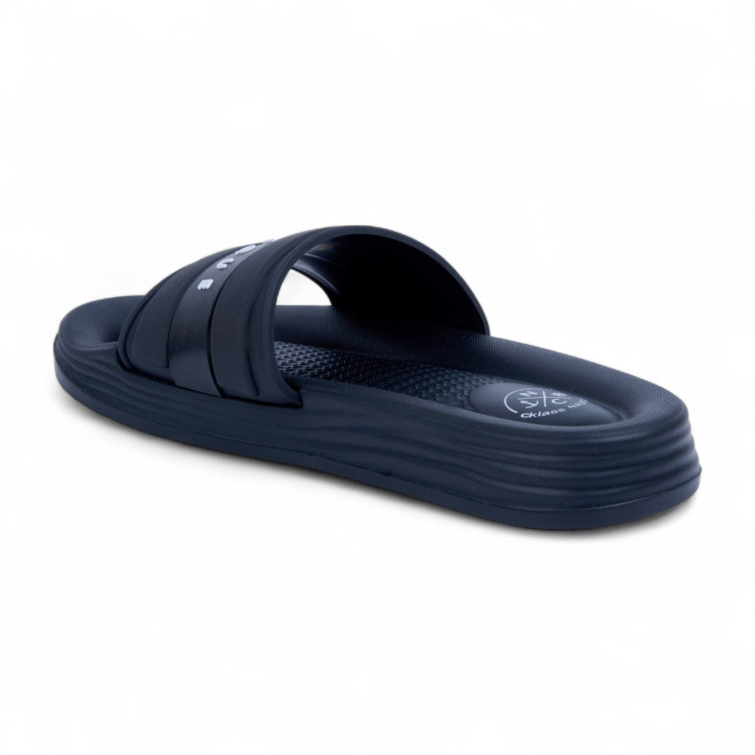 Sandalia de piso color negro con detalles en azul, confeccionada en material sintético. Cuenta con plantilla acolchada y suela ultraligera que ofrece máxima comodidad y flexibilidad al caminar. Ideal para uso diario, looks casuales o de descanso con estilo moderno y funcional.