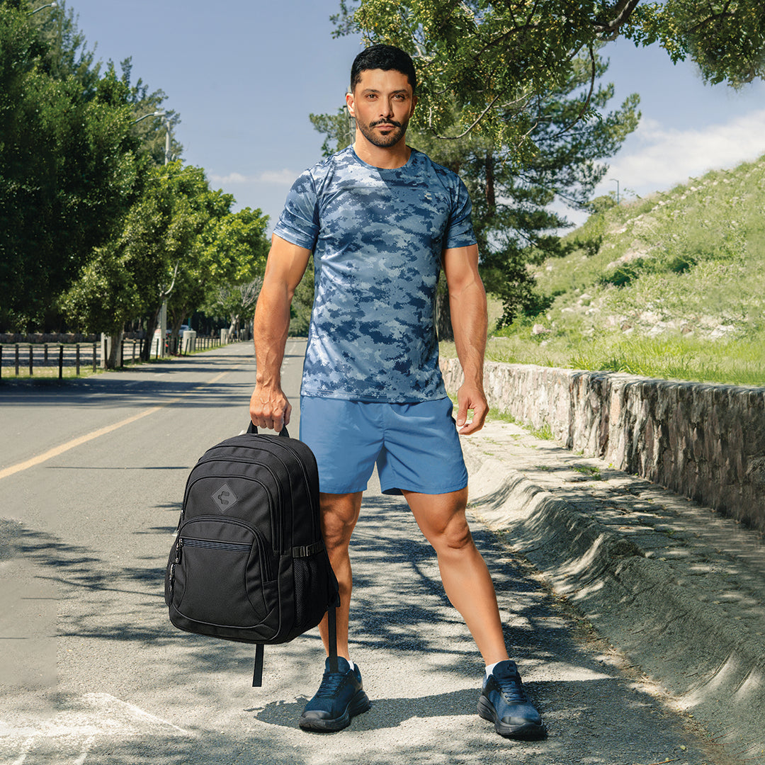 Short Charly azul para caballero con cintura elástica, detalle lateral de marca y tela ligera; ideal para entrenamientos, caminatas y uso diario con confort deportivo.
