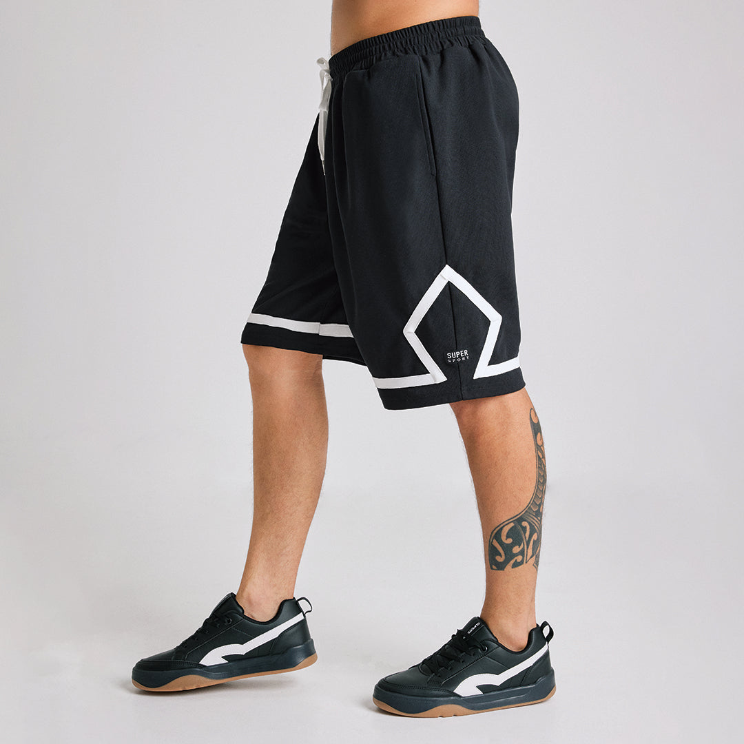 Short negro SuperSport con pretina elástica, jareta ajustable y contraste blanco; estilo runner cómodo y moderno para entrenar o uso diario.
