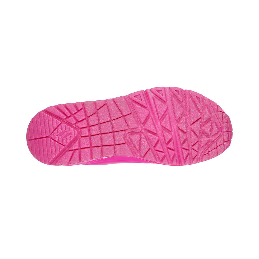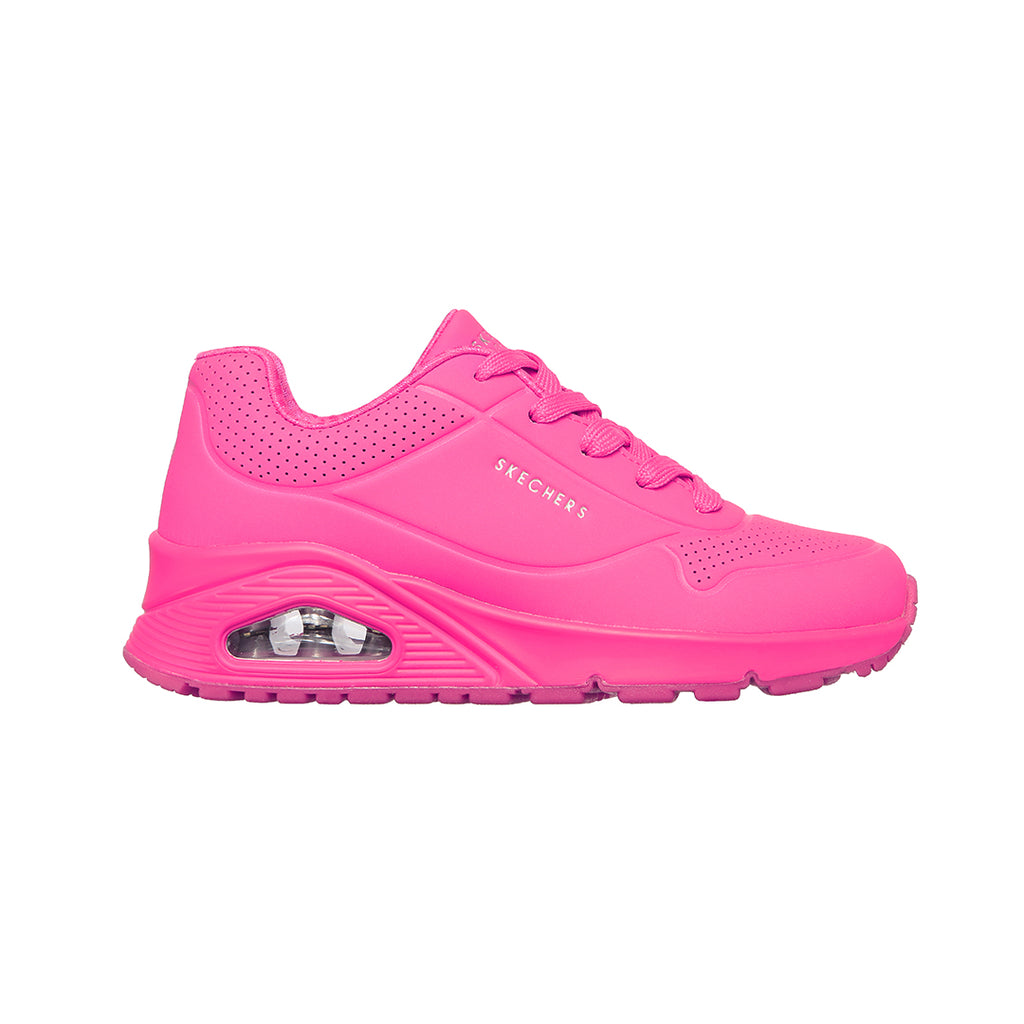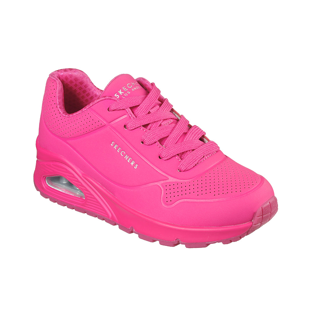 Tenis Skechers de color rosa con terminado de alta frecuencia; detalle de agujetas ajustables y burbuja de aire con plantilla memory foam. Material: Sintético.