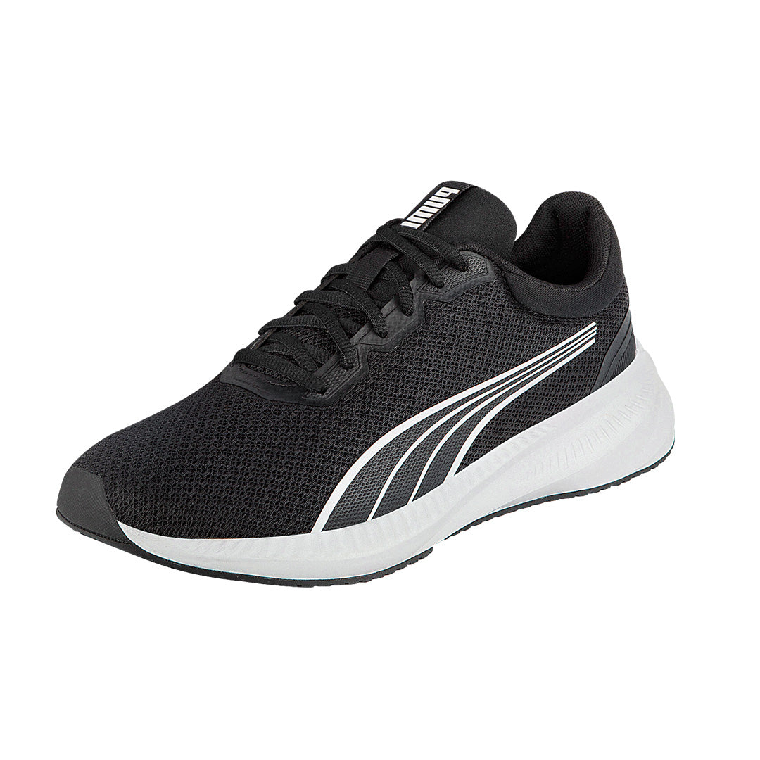 Tenis Puma color negro con suela ancha y jalador posterior, cintas ajustables y franja lateral característica de la marca. Diseño cómodo y moderno, perfecto para uso casual o urbano diario.
