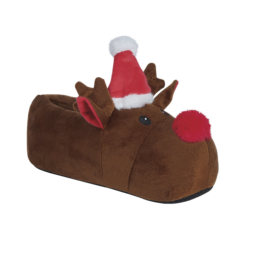 Pantufla de caballero con diseño de reno navideño, sombrero y nariz roja, multicolor, ideal para la temporada decembrina. Material textil suave y cómodo para uso en casa.