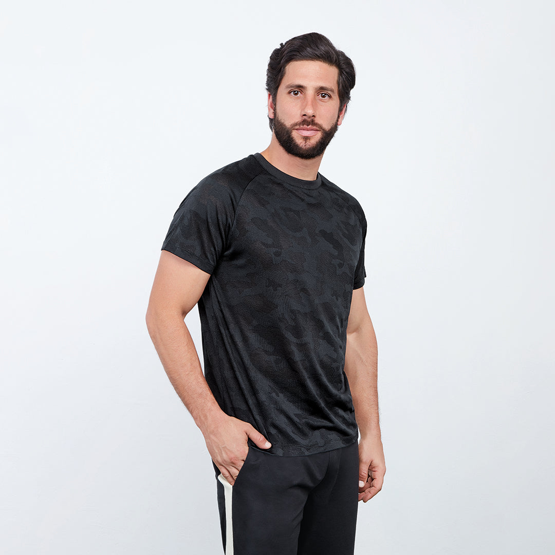 Playera negra SuperSport de manga corta con estampado militar, cuello redondo y tela ligera; diseño cómodo y moderno ideal para uso diario.