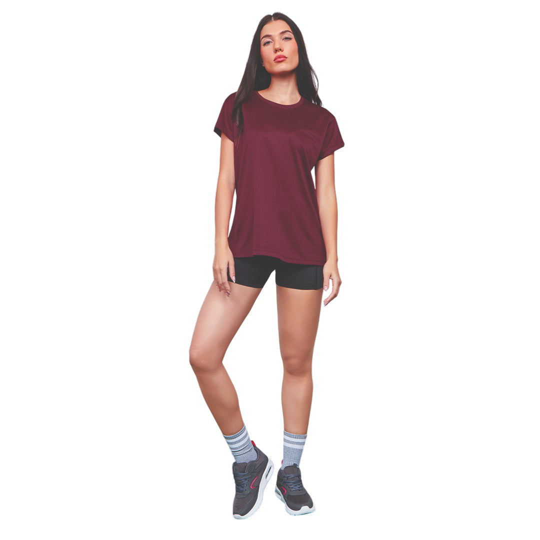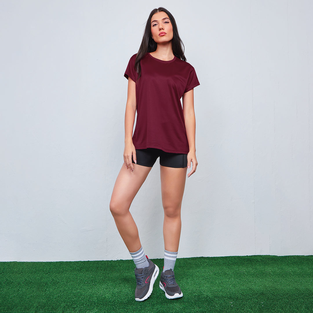 Playera color tinto SuperSport de manga corta, cuello redondo y corte regular; ligera, cómoda y perfecta para entrenamiento, uso diario o looks deportivos casuales.