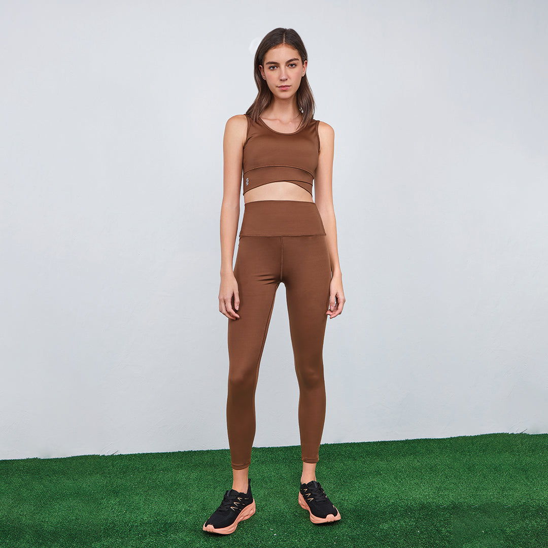 Top sport color café SuperSport con cuello redondo, copas incluidas y banda elástica ancha para soporte; cómodo, flexible y perfecto para entrenamiento o uso diario.