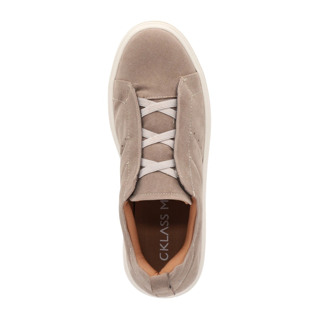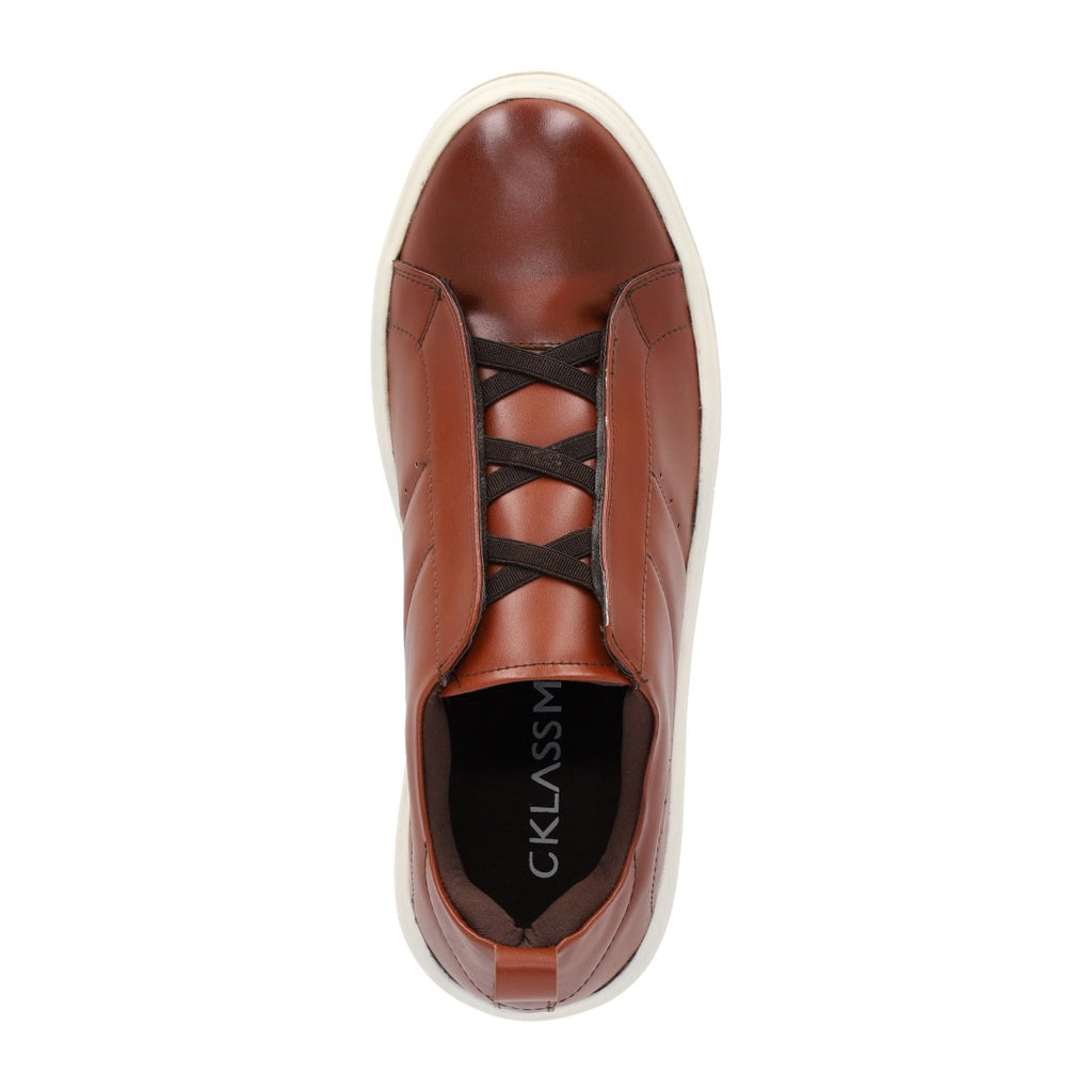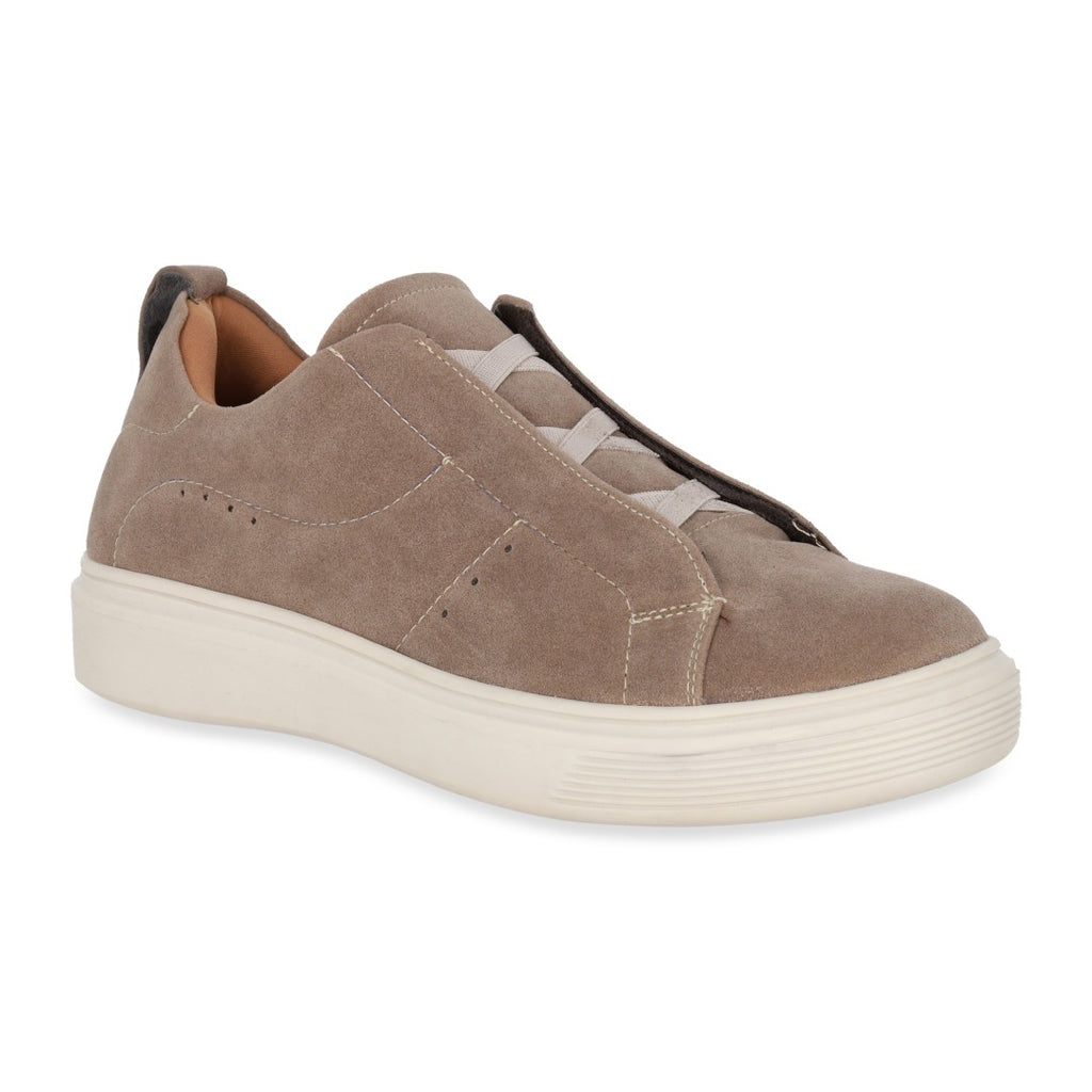 Tenis de piso con detalle de pespuntes, suela bicolor y cintas elásticas, plantilla textil color café. Perfecto para un estilo casual y cómodo.