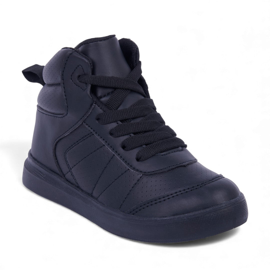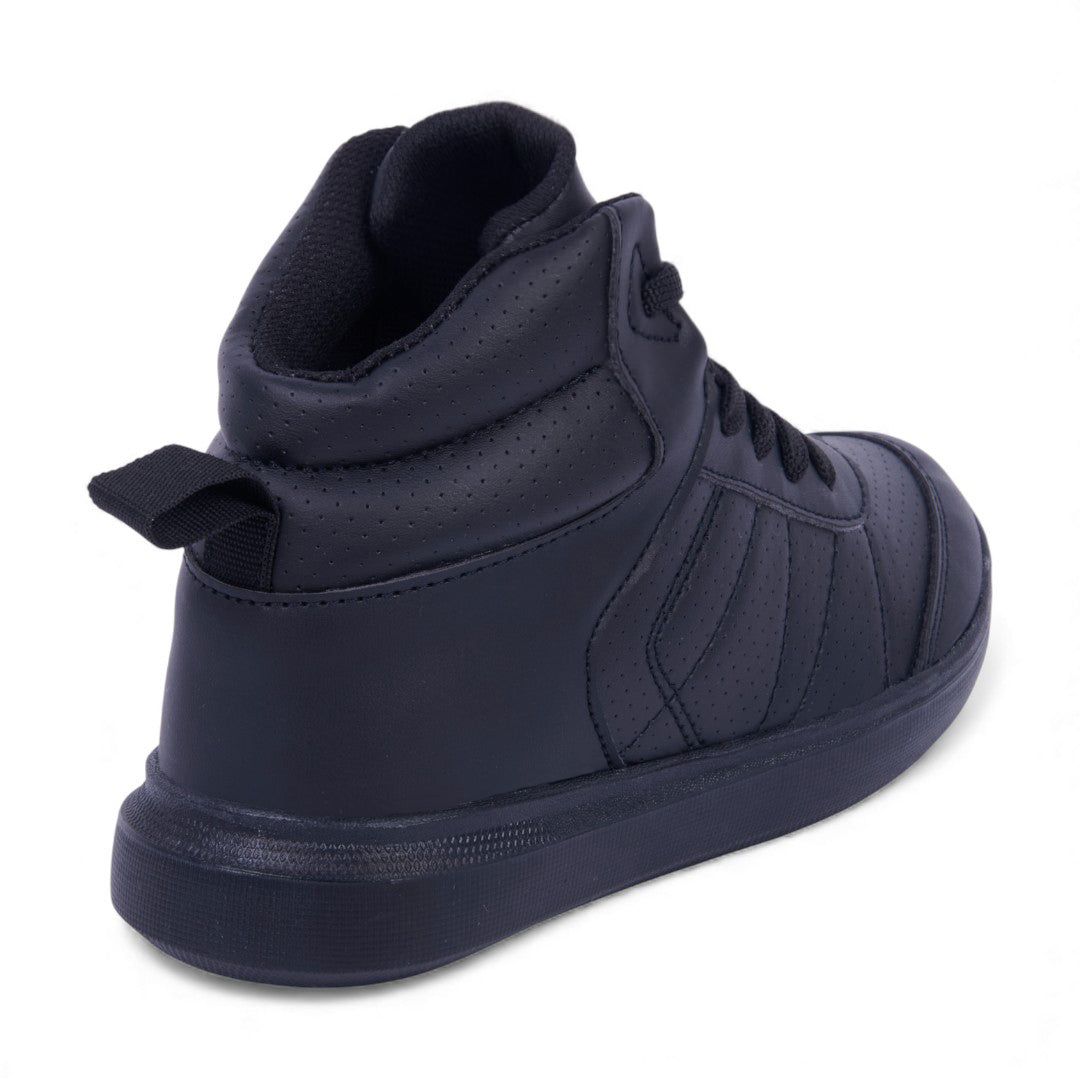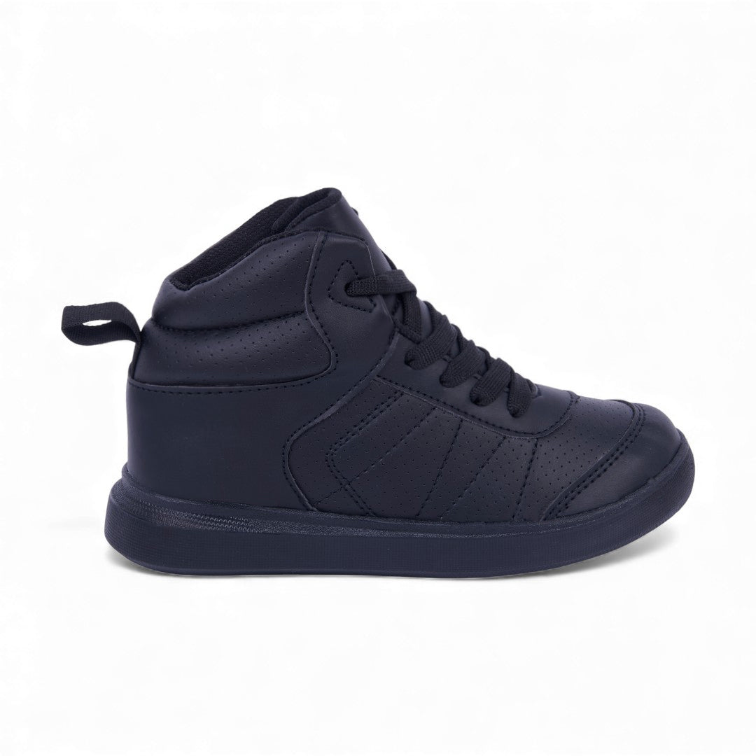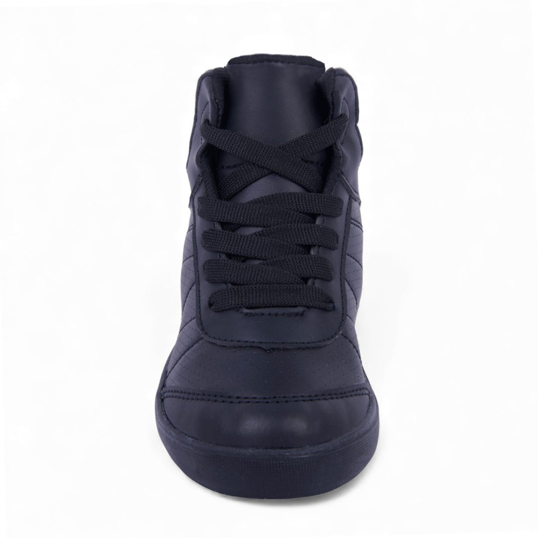 Dúo de tenis casuales en blanco y negro: modelo blanco con detalle en talón y cintas, y modelo tipo bota negro con cintas; modernos, ligeros y perfectos para uso diario.