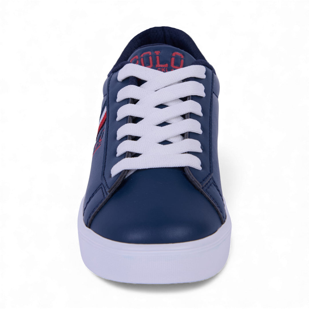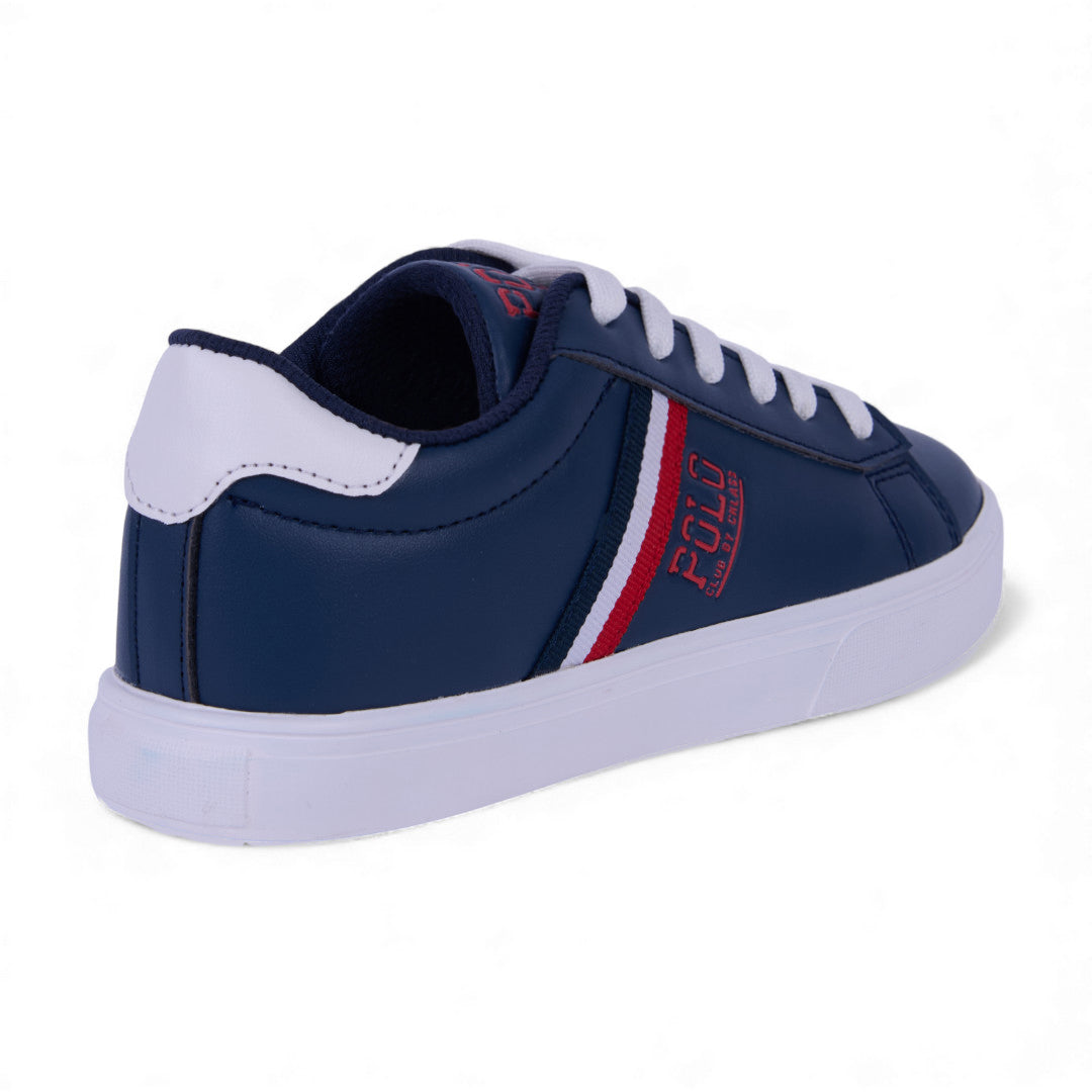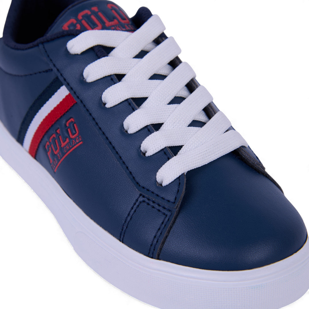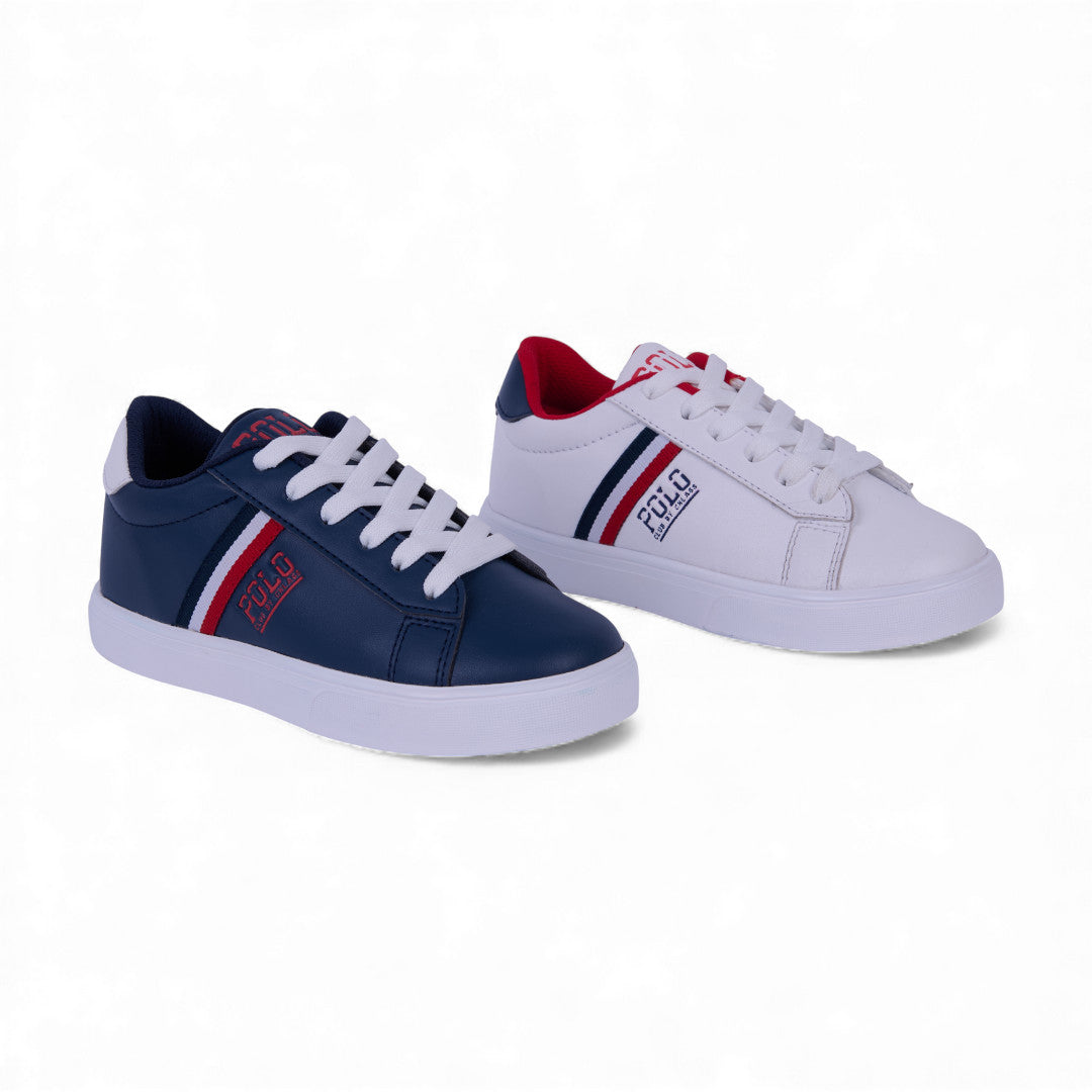 Dúo de tenis casuales para niño en azul y blanco con cintas y detalle de rayas bordadas al costado; ligeros, cómodos y perfectos para uso diario escolar o casual.