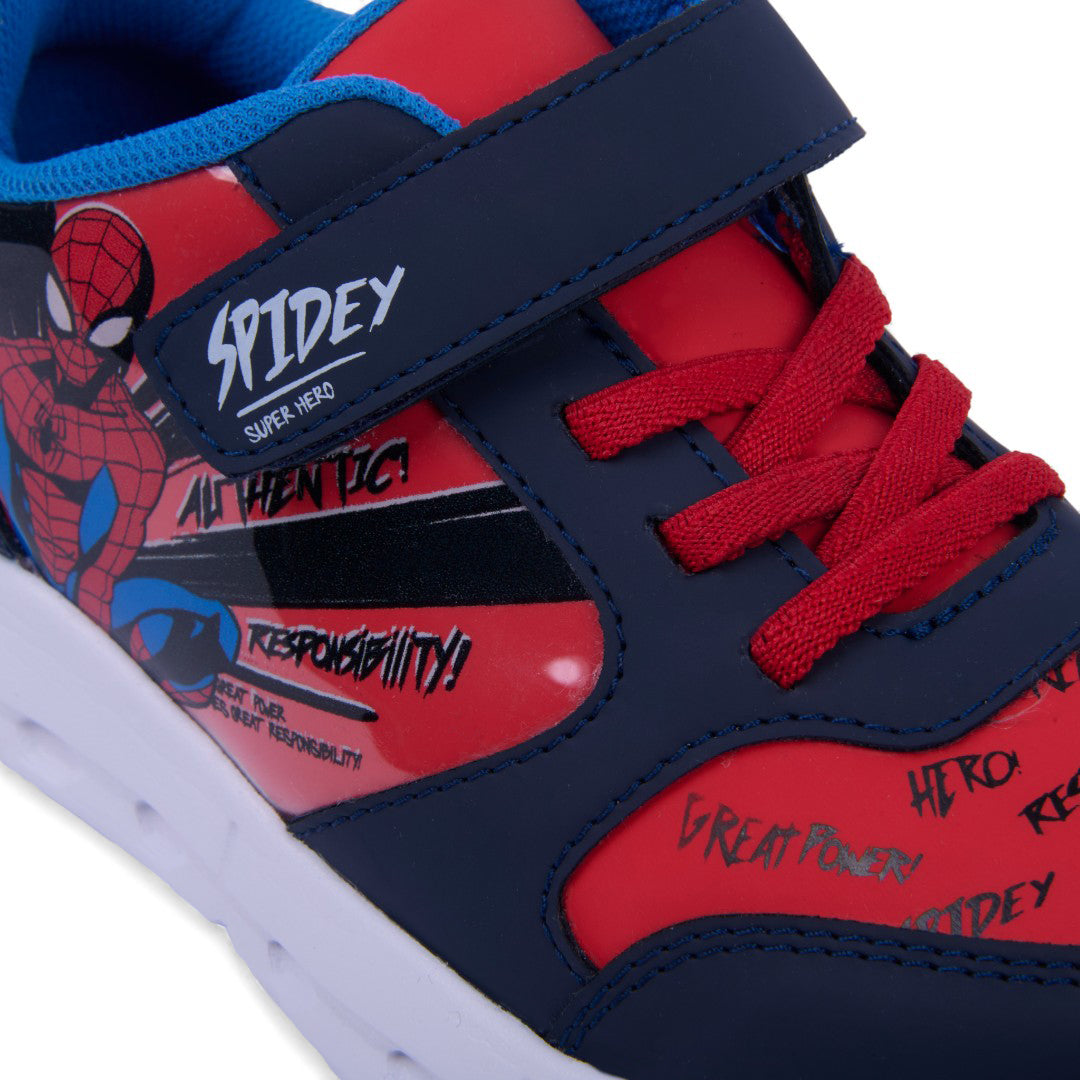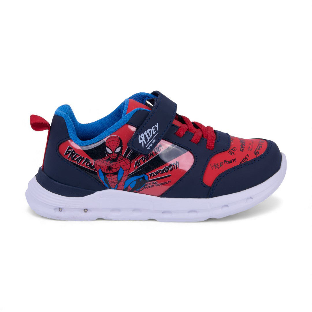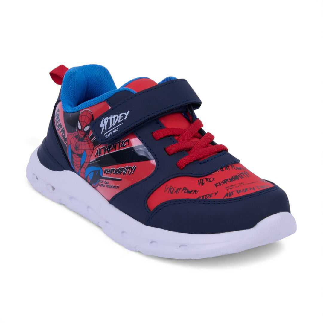 Tenis casual marino con estampado divertido, cintas y cierre con contactel, además de luces en la suela. Ligeros, cómodos y perfectos para looks infantiles dinámicos.