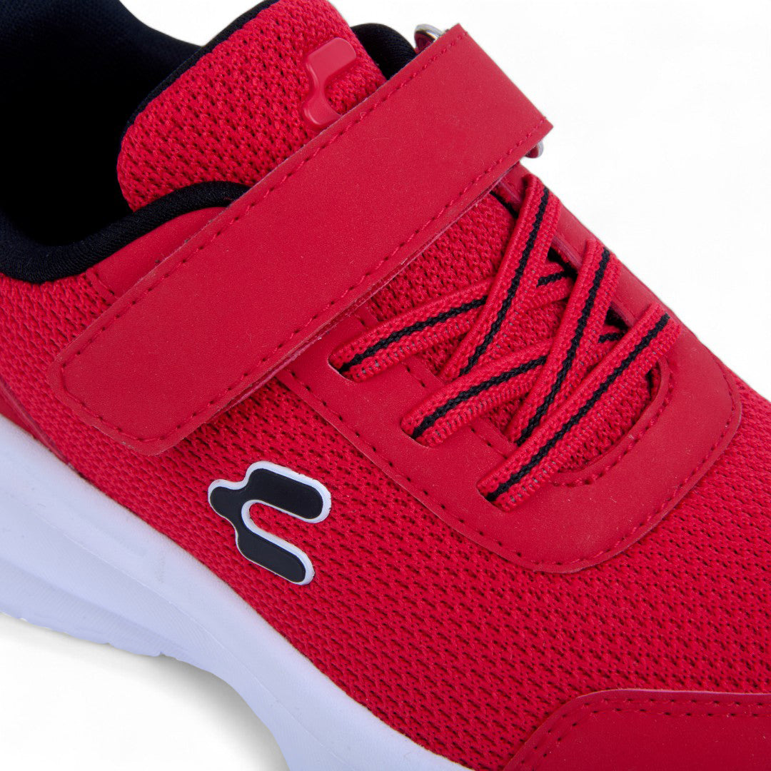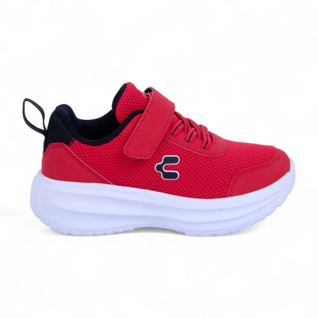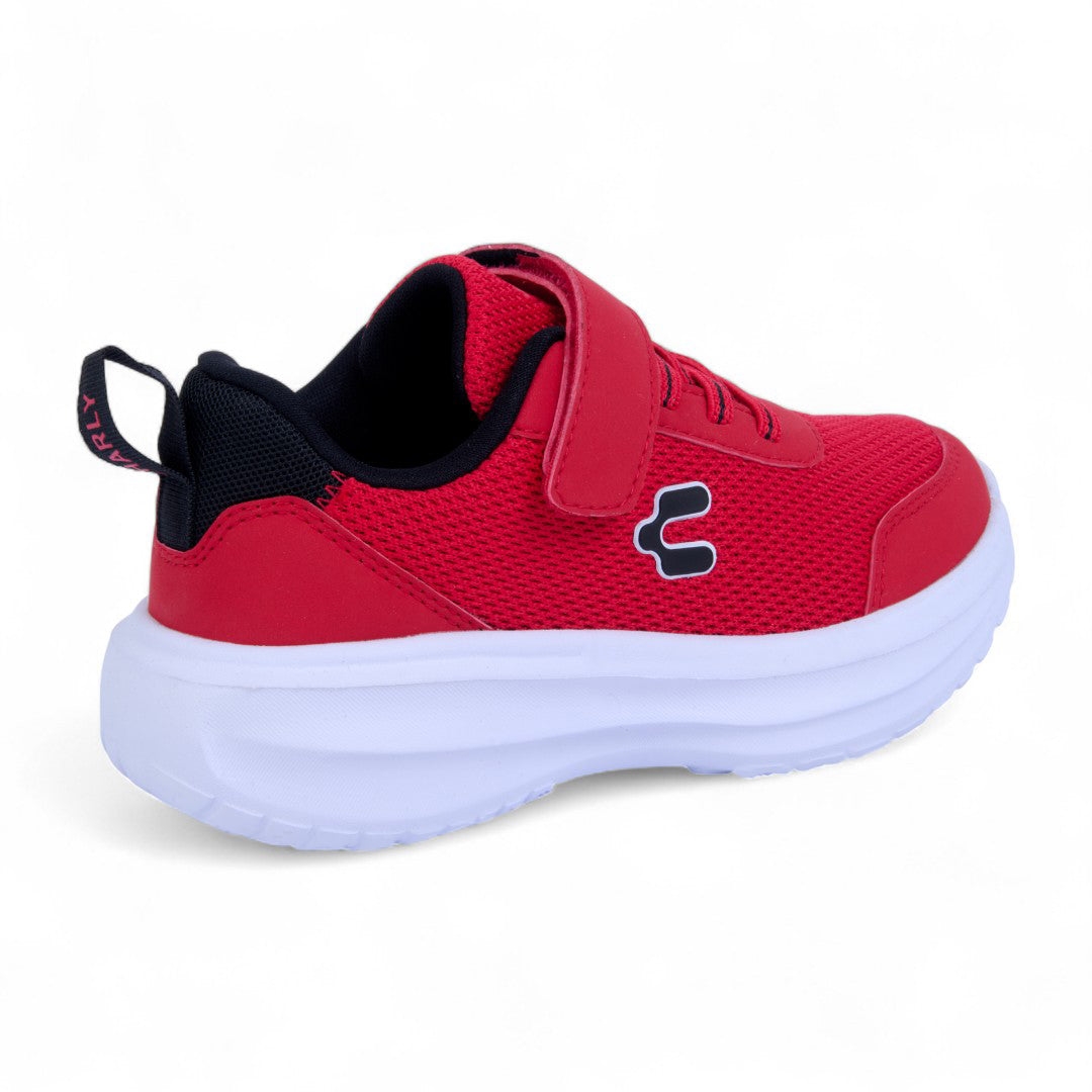 Tenis Charly rojo con malla transpirable, cintas ajustables y suela ligera tipo contactel; diseño deportivo con logo lateral que ofrece comodidad, frescura y estilo dinámico para uso diario.
