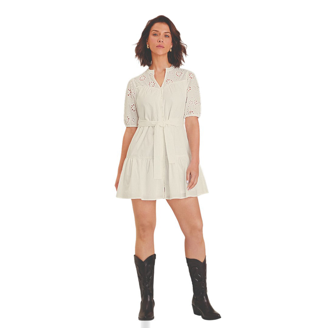 Vestido corto color ivory estilo campesino con tira bordada, cuello mao con escote “V”, manga corta con elástico, falda en capas y cinturón; fresco, romántico y perfecto para un look veraniego.