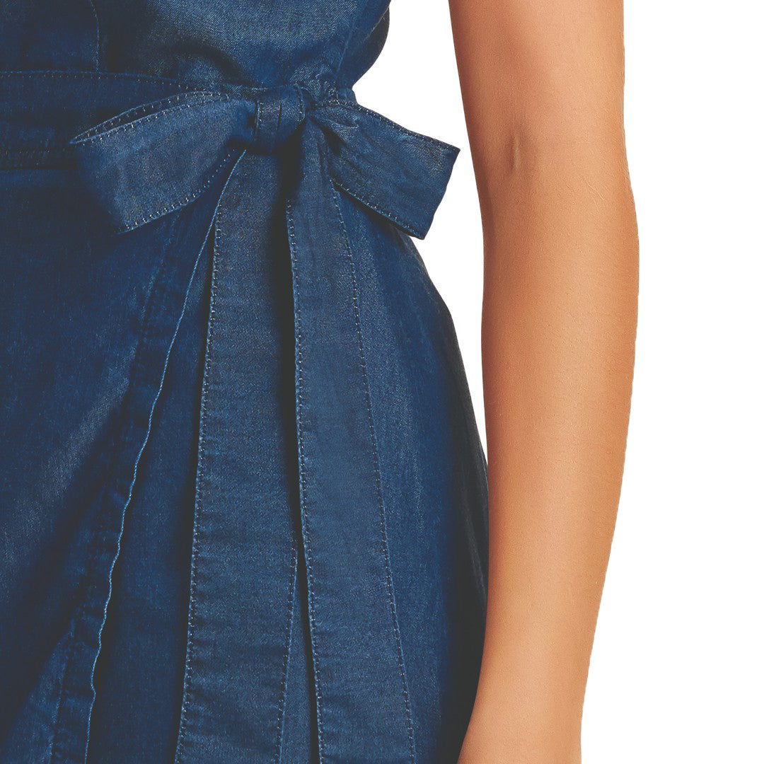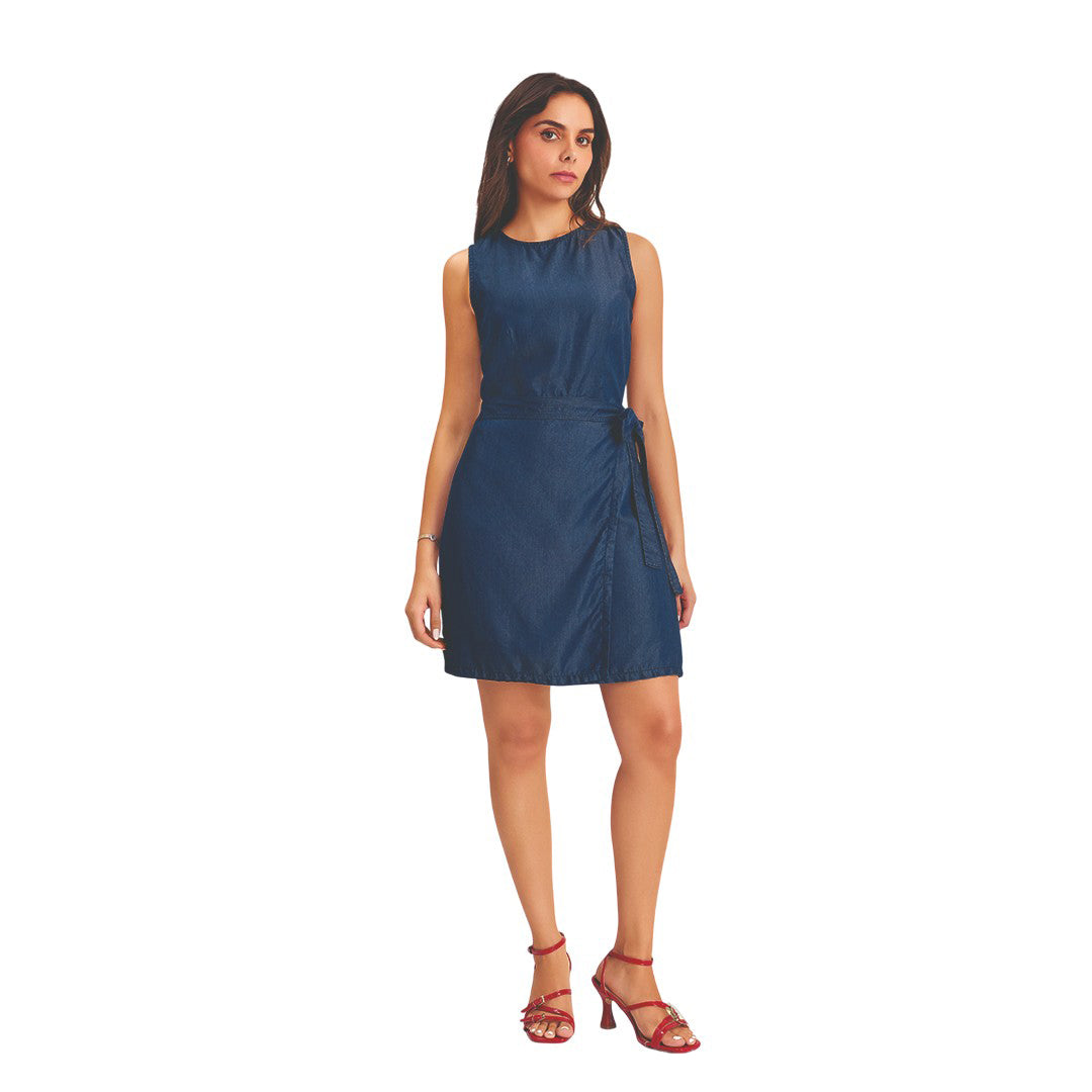 Vestido de mezclilla color azul índigo con cuello redondo, sin mangas y falda corta tipo envolvente ajustable con lazo lateral. Confeccionado en suave tejido Lyocell, ligero y fresco, ideal para climas cálidos. Su diseño versátil combina estilo casual y moderno, perfecto para salidas de día, fines de semana o un look relajado con encanto femenino.