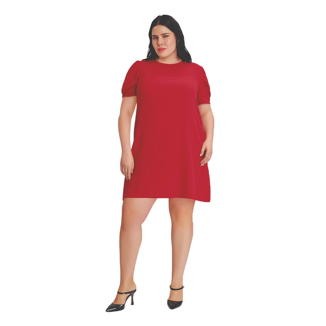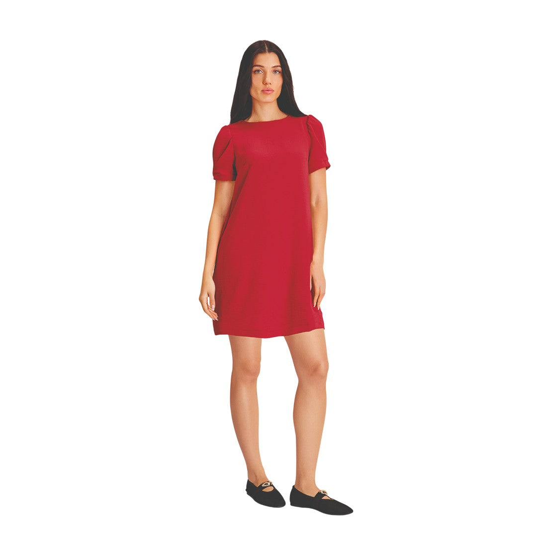 Vestido corto color rojo con cuello redondo y manga tipo tulipán que aporta un toque femenino y elegante. Incluye ligero escote posterior y bolsillos laterales funcionales. Elaborado en algodón con elastano, ofreciendo suavidad, frescura y ajuste perfecto al cuerpo. Ideal para el día o la noche, combinando estilo, comodidad y versatilidad en una sola prenda.