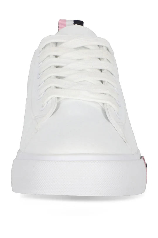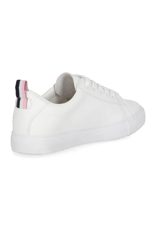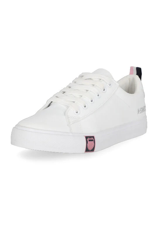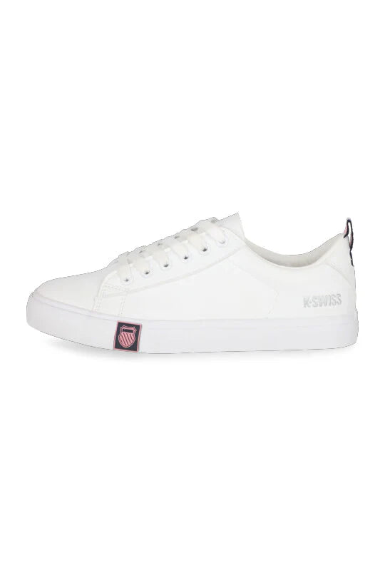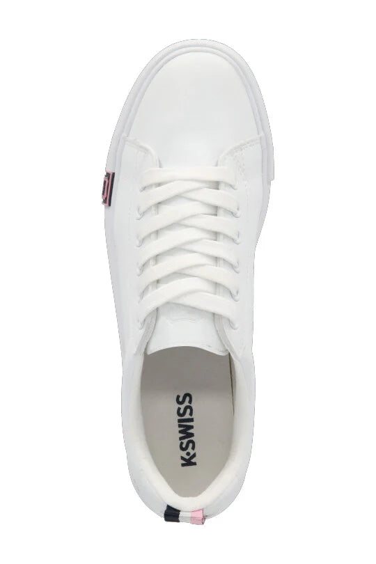 Tenis K-Swiss de color blanco con plantilla y jalador en la parte posterior; detalle de logo de la marca en lateral y cinta ajustable. Material: Sintético.