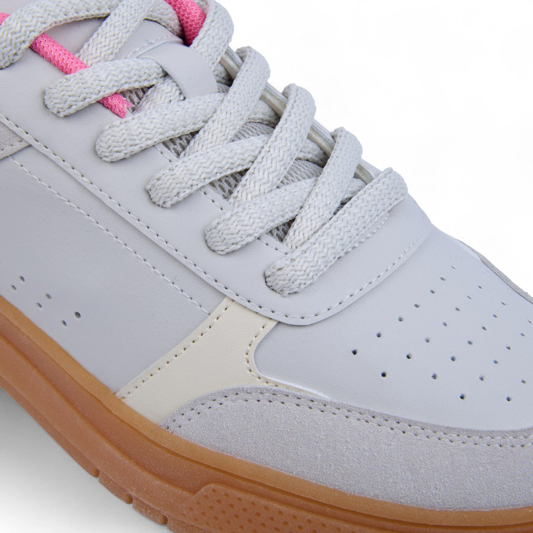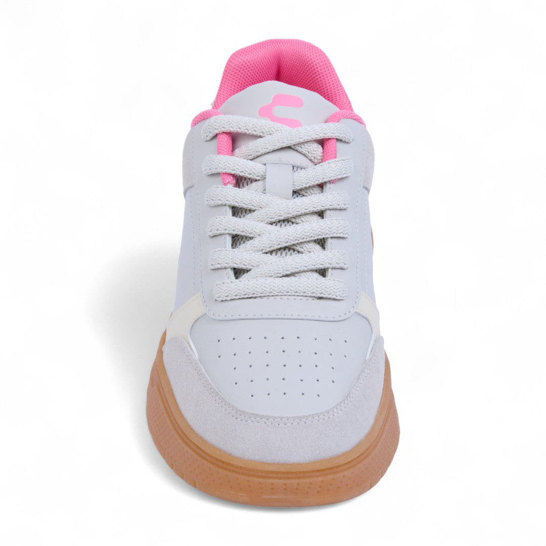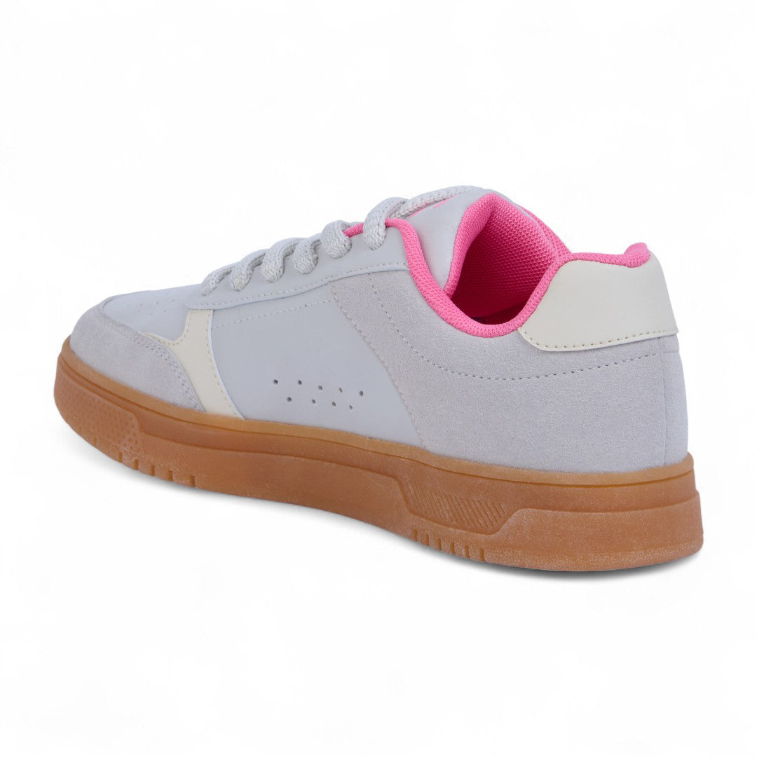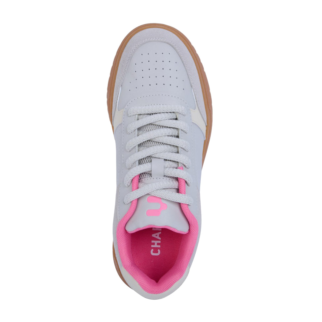 Tenis Charly beige con detalles al contraste, cinta ajustable y suela antiderrapante color liga; diseño moderno, ligero y perfecto para uso diario.