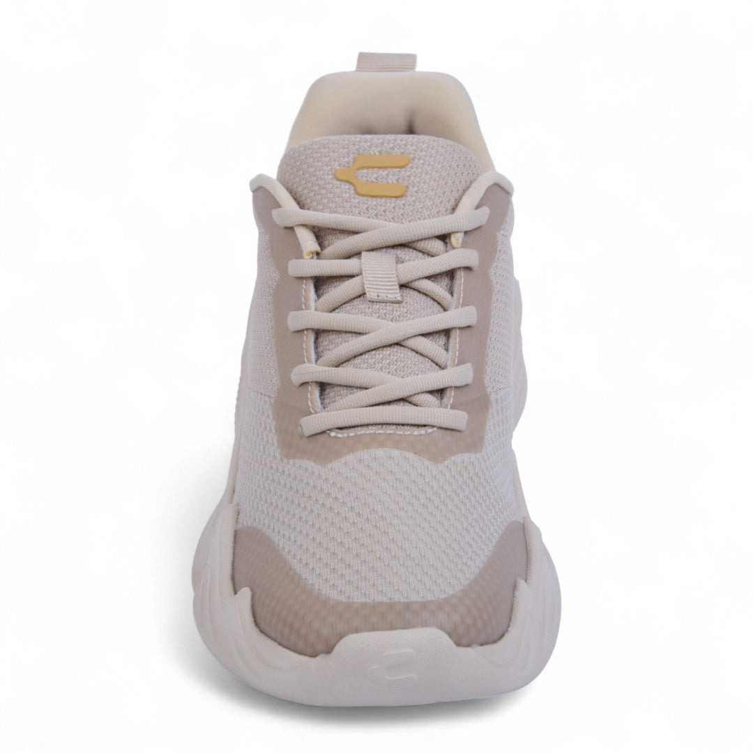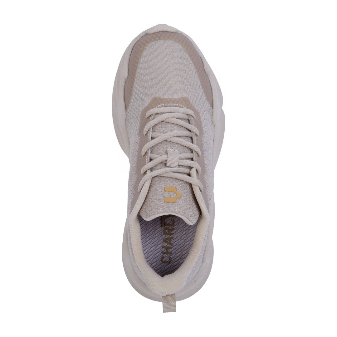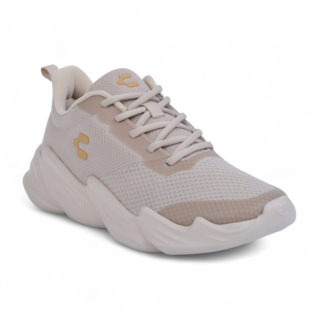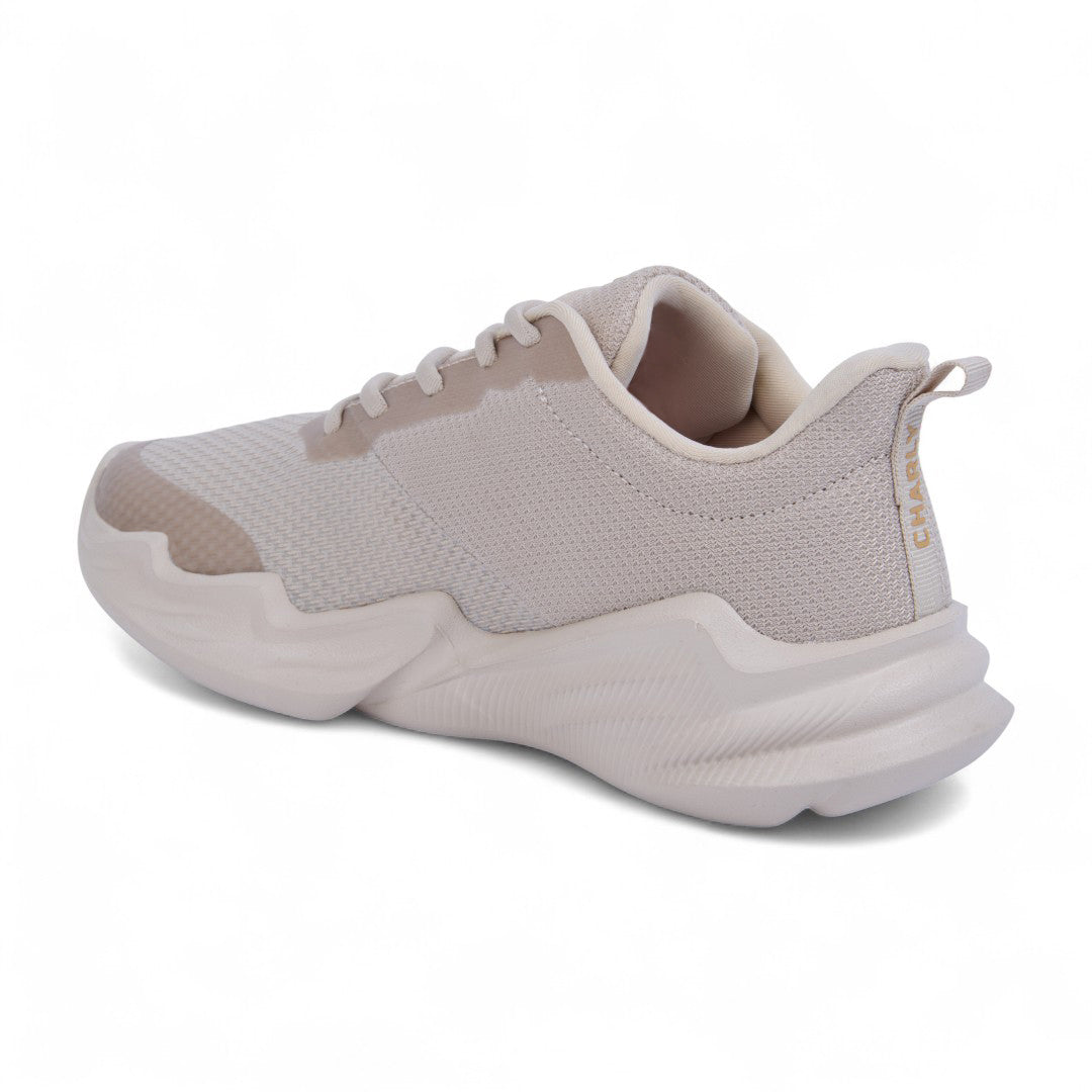 Tenis Charly beige monocromo con malla transpirable, cinta ajustable y jalador posterior; diseño urbano, suela ligera antiderrapante y comodidad para uso diario.