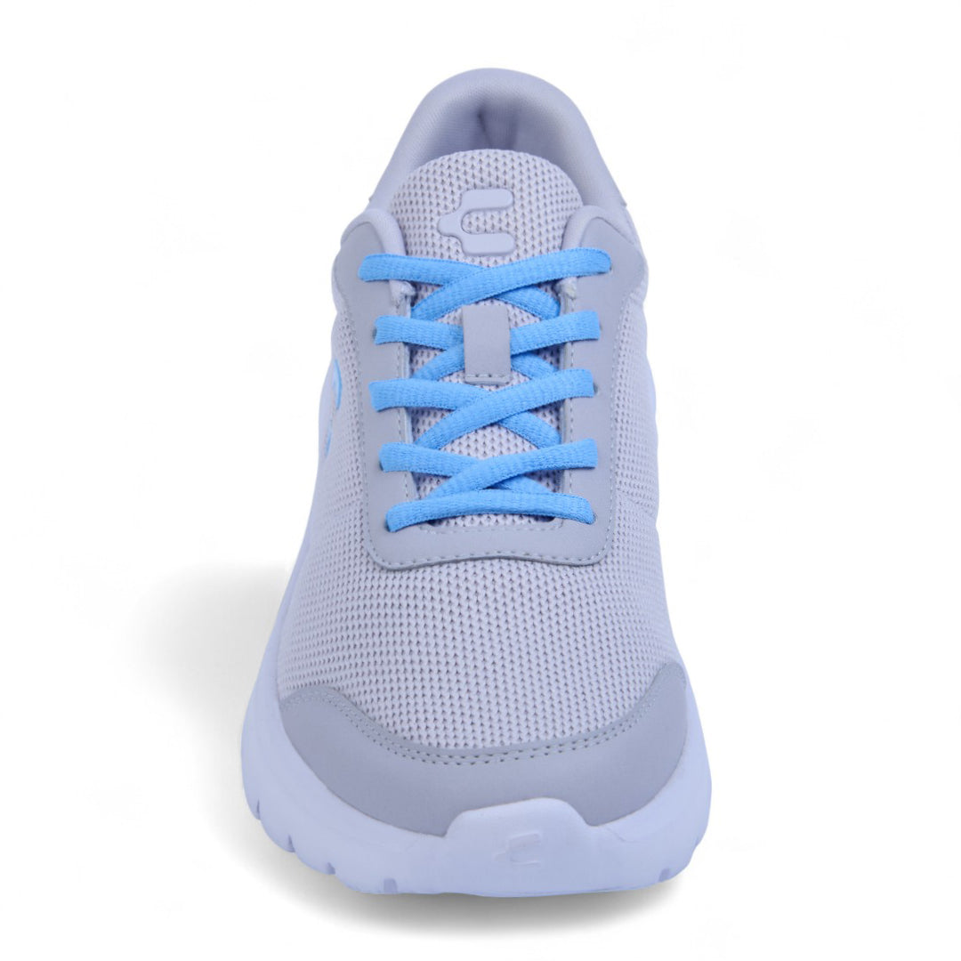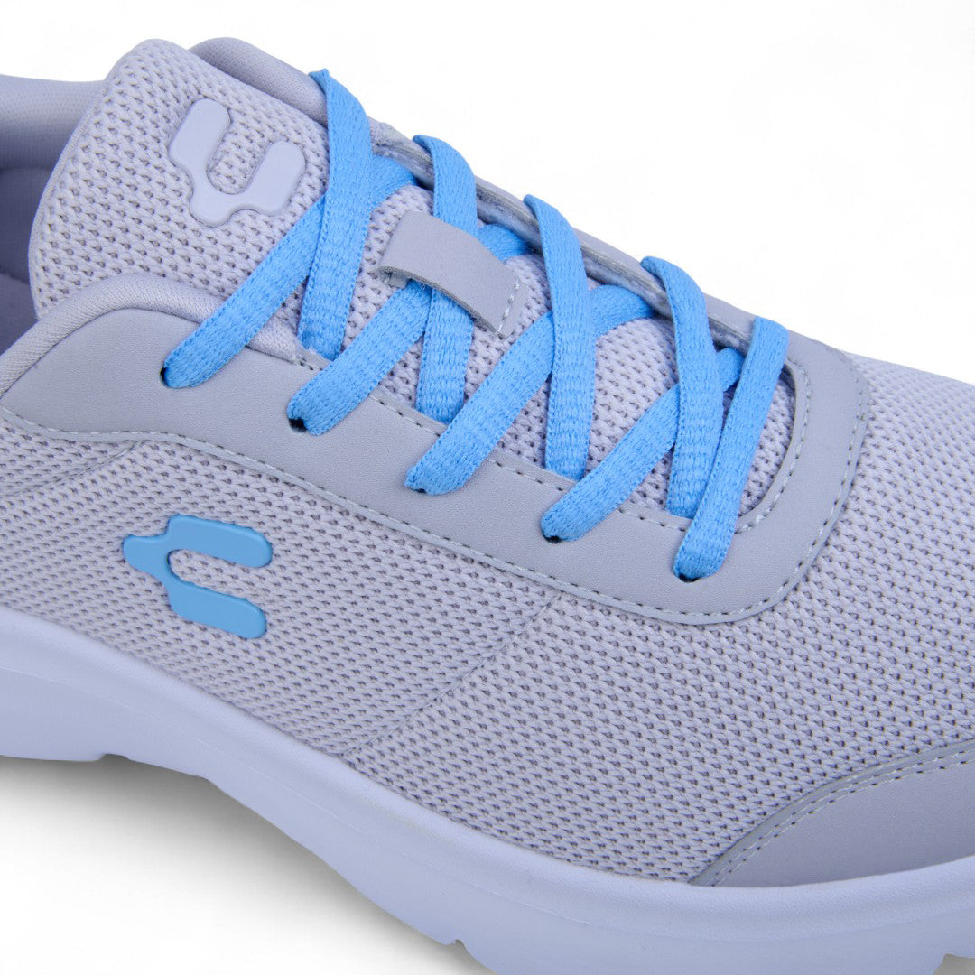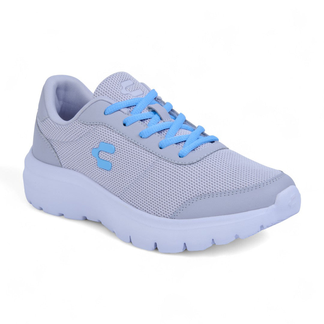 Tenis Charly grises con malla transpirable, cinta ajustable, jalador posterior y suela ligera antiderrapante; cómodos, frescos y perfectos para uso diario.